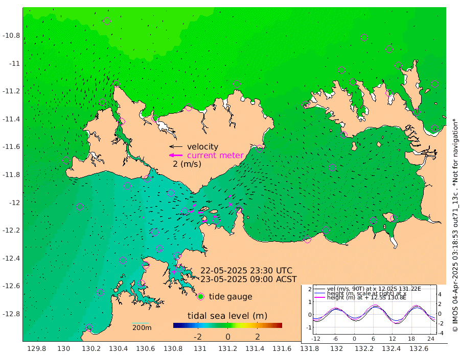 81cm/s -103T +4cm/s rms + 6cm/s 51T. Darwin_C1 52m 57cm/s -89T +4cm/s rms + 7cm/s -161T. Darwin_CW1 22m 54cm/s -108T +4cm/s rms + 8cm/s 61T. Darwin_CW2 34m 44cm/s -132T +3cm/s rms + 9cm/s 98T. Darwin_CW3 22m 80cm/s -91T +5cm/s rms + 7cm/s 88T. Darwin_C3 56m 47cm/s -115T +2cm/s rms + 9cm/s -126T. Darwin_CTbW 22m 14cm/s -101T +1cm/s rms + 1cm/s -47T. DARBGF 30m 9cm/s -86T +4cm/s rms + 3cm/s 80T. NRSDAR 19m 27cm Goodrich Bank -98cm Point Jenny -96cm Native Point -94cm Fish Reef -110cm Tapa Bay -30cm Point Fawcett (Offshore) -117cm Burge Point -99cm Munkunuwa -71cm Beagle A -116cm Parsons Bank -108cm Fenton Patches -117cm Hancox Shoal Area -122cm Nightcliff -123cm Darwin -108cm Charles Point Patches -92cm Glyde Point -84cm Chambers Bay -74cm Point Stuart -77cm Cape Hotham -76cm Christine Reef -79cm West Alligator Head -69cm East Field Island -62cm Two Hills Bay -66cm Camp Point -100cm Medina Inlet South -18cm South Barlow Point 0cm St. Asaph Bay 22cm Cape Van Dieman 22cm Snake Bay 20cm Cache Point 8cm Point Jahleel (Off) -31cm Cape Don -3cm Port Essington -2cm Smith Point - West -1cm NW Peacock Island 13cm North Of Jones Shoal 3cm Peacock Island -24cm Point David -6cm D'urville Point -27cm Copeland Island -19cm One Tree Point