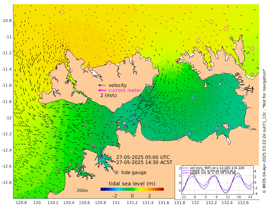 54cm/s -101T +4cm/s rms + 6cm/s 51T. Darwin_C1 52m 68cm/s -91T +4cm/s rms + 7cm/s -161T. Darwin_CW1 22m 15cm/s -109T +4cm/s rms + 8cm/s 61T. Darwin_CW2 34m 61cm/s -137T +3cm/s rms + 9cm/s 98T. Darwin_CW3 22m 52cm/s -90T +5cm/s rms + 7cm/s 88T. Darwin_C3 56m 10cm/s -110T +2cm/s rms + 9cm/s -126T. Darwin_CTbW 22m 49cm/s 98T +1cm/s rms + 1cm/s -47T. DARBGF 30m 52cm/s 131T +4cm/s rms + 3cm/s 80T. NRSDAR 19m 113cm Goodrich Bank 27cm Point Jenny 30cm Native Point 25cm Fish Reef 10cm Tapa Bay 92cm Point Fawcett (Offshore) -3cm Burge Point 11cm Munkunuwa 54cm Beagle A -11cm Parsons Bank 4cm Fenton Patches -27cm Hancox Shoal Area -21cm Nightcliff -21cm Darwin 11cm Charles Point Patches -46cm Glyde Point -102cm Chambers Bay -114cm Point Stuart -58cm Cape Hotham -92cm Christine Reef -138cm West Alligator Head -159cm East Field Island -62cm Two Hills Bay -58cm Camp Point 16cm Medina Inlet South 100cm South Barlow Point 107cm St. Asaph Bay 117cm Cape Van Dieman 119cm Snake Bay 111cm Cache Point 86cm Point Jahleel (Off) 41cm Cape Don 86cm Port Essington 87cm Smith Point - West 86cm NW Peacock Island 96cm North Of Jones Shoal 33cm Peacock Island 61cm Point David 86cm D'urville Point 54cm Copeland Island 65cm One Tree Point