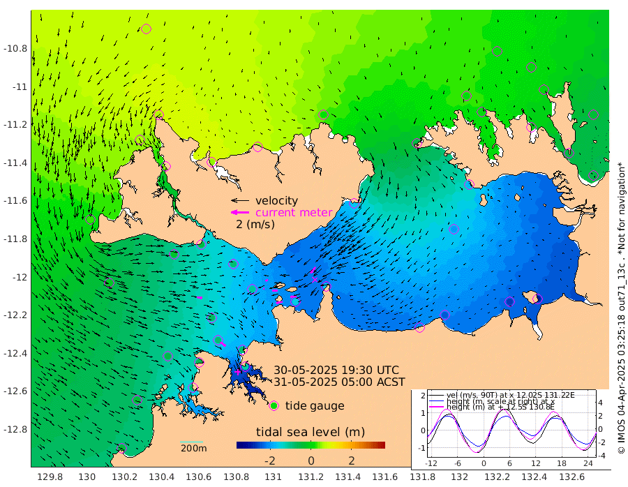 74cm/s -101T +4cm/s rms + 6cm/s 51T. Darwin_C1 52m 62cm/s -93T +4cm/s rms + 7cm/s -161T. Darwin_CW1 22m 12cm/s -102T +4cm/s rms + 8cm/s 61T. Darwin_CW2 34m 86cm/s -140T +3cm/s rms + 9cm/s 98T. Darwin_CW3 22m 55cm/s -88T +5cm/s rms + 7cm/s 88T. Darwin_C3 56m 27cm/s -115T +2cm/s rms + 9cm/s -126T. Darwin_CTbW 22m 61cm/s 98T +1cm/s rms + 1cm/s -47T. DARBGF 30m 71cm/s 128T +4cm/s rms + 3cm/s 80T. NRSDAR 19m 56cm Goodrich Bank -38cm Point Jenny -34cm Native Point -48cm Fish Reef -58cm Tapa Bay 30cm Point Fawcett (Offshore) -83cm Burge Point -25cm Munkunuwa -12cm Beagle A -85cm Parsons Bank -69cm Fenton Patches -102cm Hancox Shoal Area -86cm Nightcliff -114cm Darwin -83cm Charles Point Patches -147cm Glyde Point -212cm Chambers Bay -236cm Point Stuart -161cm Cape Hotham -192cm Christine Reef -261cm West Alligator Head -294cm East Field Island -172cm Two Hills Bay -167cm Camp Point -54cm Medina Inlet South 45cm South Barlow Point 59cm St. Asaph Bay 60cm Cape Van Dieman 54cm Snake Bay 44cm Cache Point 19cm Point Jahleel (Off) -51cm Cape Don 1cm Port Essington 9cm Smith Point - West 0cm NW Peacock Island 21cm North Of Jones Shoal 4cm Peacock Island -47cm Point David -1cm D'urville Point -52cm Copeland Island -43cm One Tree Point