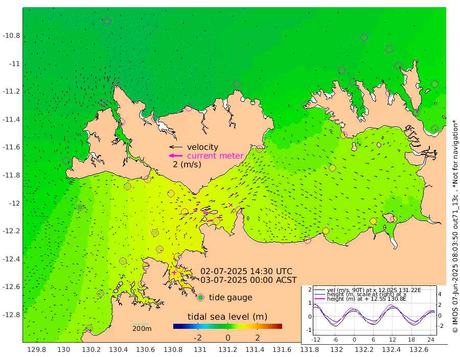 79cm/s 80T +4cm/s rms + 6cm/s 51T. Darwin_C1 52m 51cm/s 92T +4cm/s rms + 7cm/s -161T. Darwin_CW1 22m 49cm/s 71T +4cm/s rms + 8cm/s 61T. Darwin_CW2 34m 43cm/s 48T +3cm/s rms + 9cm/s 98T. Darwin_CW3 22m 81cm/s 89T +5cm/s rms + 7cm/s 88T. Darwin_C3 56m 39cm/s 66T +2cm/s rms + 9cm/s -126T. Darwin_CTbW 22m 3cm/s 1T +1cm/s rms + 1cm/s -47T. DARBGF 30m 12cm/s -37T +4cm/s rms + 3cm/s 80T. NRSDAR 19m -44cm Goodrich Bank 43cm Point Jenny 39cm Native Point 56cm Fish Reef 61cm Tapa Bay 6cm Point Fawcett (Offshore) 57cm Burge Point 55cm Munkunuwa 16cm Beagle A 76cm Parsons Bank 49cm Fenton Patches 80cm Hancox Shoal Area 77cm Nightcliff 84cm Darwin 66cm Charles Point Patches 72cm Glyde Point 90cm Chambers Bay 92cm Point Stuart 78cm Cape Hotham 67cm Christine Reef 102cm West Alligator Head 97cm East Field Island 74cm Two Hills Bay 55cm Camp Point 59cm Medina Inlet South -12cm South Barlow Point -24cm St. Asaph Bay -41cm Cape Van Dieman -36cm Snake Bay -33cm Cache Point -17cm Point Jahleel (Off) 22cm Cape Don -4cm Port Essington -4cm Smith Point - West -4cm NW Peacock Island -11cm North Of Jones Shoal -2cm Peacock Island 25cm Point David 1cm D'urville Point 30cm Copeland Island 23cm One Tree Point