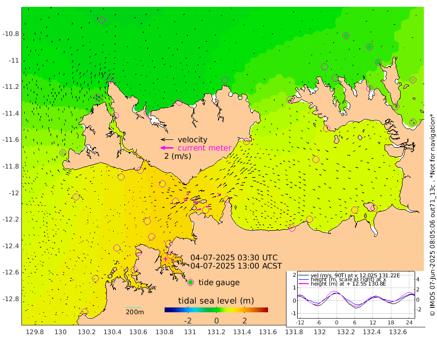 68cm/s 78T +4cm/s rms + 6cm/s 51T. Darwin_C1 52m 47cm/s 90T +4cm/s rms + 7cm/s -161T. Darwin_CW1 22m 52cm/s 72T +4cm/s rms + 8cm/s 61T. Darwin_CW2 34m 39cm/s 48T +3cm/s rms + 9cm/s 98T. Darwin_CW3 22m 87cm/s 89T +5cm/s rms + 7cm/s 88T. Darwin_C3 56m 40cm/s 65T +2cm/s rms + 9cm/s -126T. Darwin_CTbW 22m 5cm/s 7T +1cm/s rms + 1cm/s -47T. DARBGF 30m 11cm/s -29T +4cm/s rms + 3cm/s 80T. NRSDAR 19m -5cm Goodrich Bank 81cm Point Jenny 79cm Native Point 95cm Fish Reef 91cm Tapa Bay 37cm Point Fawcett (Offshore) 105cm Burge Point 79cm Munkunuwa 70cm Beagle A 105cm Parsons Bank 102cm Fenton Patches 104cm Hancox Shoal Area 110cm Nightcliff 124cm Darwin 106cm Charles Point Patches 106cm Glyde Point 108cm Chambers Bay 110cm Point Stuart 97cm Cape Hotham 95cm Christine Reef 119cm West Alligator Head 120cm East Field Island 95cm Two Hills Bay 86cm Camp Point 97cm Medina Inlet South 30cm South Barlow Point 11cm St. Asaph Bay -4cm Cape Van Dieman 4cm Snake Bay 2cm Cache Point 14cm Point Jahleel (Off) 52cm Cape Don 24cm Port Essington 23cm Smith Point - West 22cm NW Peacock Island 13cm North Of Jones Shoal 6cm Peacock Island 35cm Point David 26cm D'urville Point 37cm Copeland Island 39cm One Tree Point