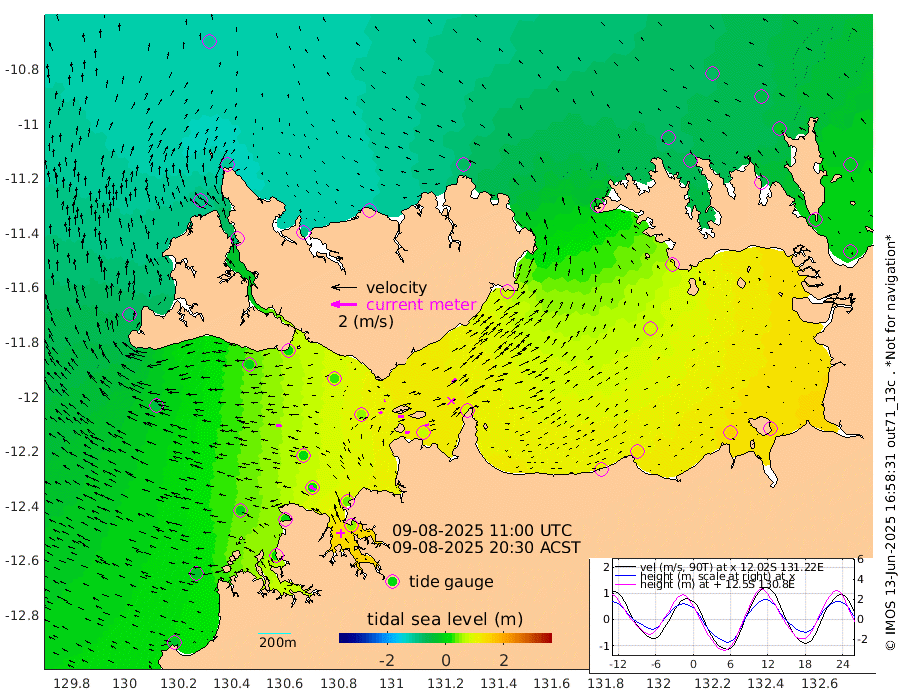 32cm/s 83T +4cm/s rms + 6cm/s 51T. Darwin_C1 52m 32cm/s 91T +4cm/s rms + 7cm/s -161T. Darwin_CW1 22m 25cm/s 62T +4cm/s rms + 8cm/s 61T. Darwin_CW2 34m 42cm/s 41T +3cm/s rms + 9cm/s 98T. Darwin_CW3 22m 42cm/s 89T +5cm/s rms + 7cm/s 88T. Darwin_C3 56m 9cm/s 66T +2cm/s rms + 9cm/s -126T. Darwin_CTbW 22m 45cm/s -83T +1cm/s rms + 1cm/s -47T. DARBGF 30m 58cm/s -54T +4cm/s rms + 3cm/s 80T. NRSDAR 19m -105cm Goodrich Bank -24cm Point Jenny -25cm Native Point -7cm Fish Reef 6cm Tapa Bay -83cm Point Fawcett (Offshore) 15cm Burge Point -5cm Munkunuwa -46cm Beagle A 34cm Parsons Bank 11cm Fenton Patches 49cm Hancox Shoal Area 40cm Nightcliff 56cm Darwin 22cm Charles Point Patches 70cm Glyde Point 116cm Chambers Bay 129cm Point Stuart 83cm Cape Hotham 89cm Christine Reef 147cm West Alligator Head 168cm East Field Island 80cm Two Hills Bay 79cm Camp Point 4cm Medina Inlet South -86cm South Barlow Point -101cm St. Asaph Bay -107cm Cape Van Dieman -99cm Snake Bay -101cm Cache Point -72cm Point Jahleel (Off) -20cm Cape Don -58cm Port Essington -63cm Smith Point - West -56cm NW Peacock Island -72cm North Of Jones Shoal -22cm Peacock Island -8cm Point David -53cm D'urville Point 0cm Copeland Island -17cm One Tree Point