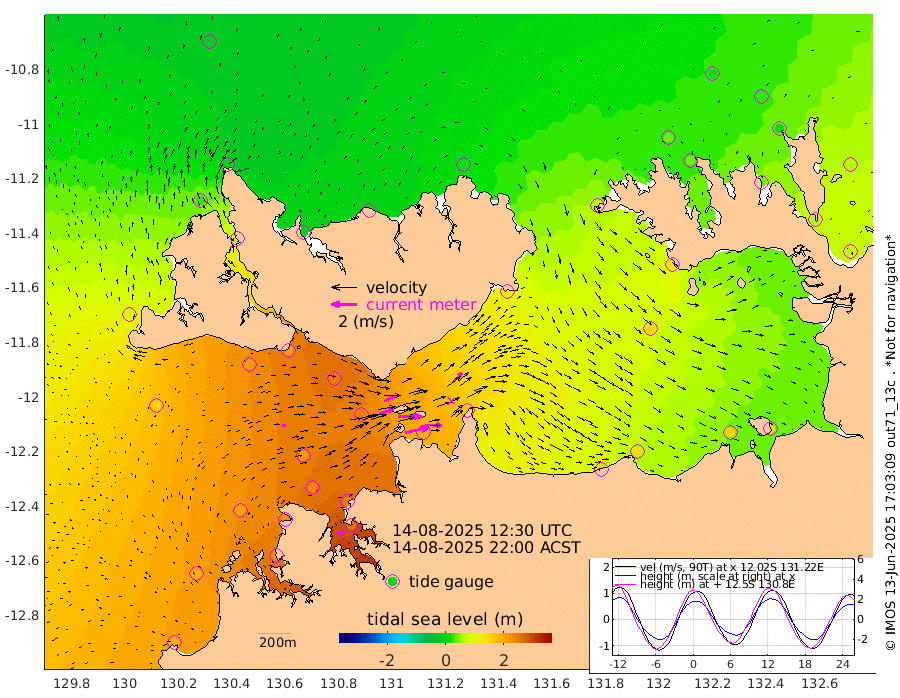 191cm/s 78T +4cm/s rms + 6cm/s 51T. Darwin_C1 52m 135cm/s 92T +4cm/s rms + 7cm/s -161T. Darwin_CW1 22m 116cm/s 73T +4cm/s rms + 8cm/s 61T. Darwin_CW2 34m 104cm/s 45T +3cm/s rms + 9cm/s 98T. Darwin_CW3 22m 182cm/s 89T +5cm/s rms + 7cm/s 88T. Darwin_C3 56m 95cm/s 66T +2cm/s rms + 9cm/s -126T. Darwin_CTbW 22m 26cm/s 74T +1cm/s rms + 1cm/s -47T. DARBGF 30m 18cm/s 86T +4cm/s rms + 3cm/s 80T. NRSDAR 19m -16cm Goodrich Bank 188cm Point Jenny 185cm Native Point 195cm Fish Reef 218cm Tapa Bay 82cm Point Fawcett (Offshore) 230cm Burge Point 206cm Munkunuwa 145cm Beagle A 240cm Parsons Bank 213cm Fenton Patches 238cm Hancox Shoal Area 239cm Nightcliff 256cm Darwin 229cm Charles Point Patches 183cm Glyde Point 150cm Chambers Bay 139cm Point Stuart 158cm Cape Hotham 139cm Christine Reef 148cm West Alligator Head 126cm East Field Island 128cm Two Hills Bay 122cm Camp Point 209cm Medina Inlet South 66cm South Barlow Point 31cm St. Asaph Bay -11cm Cape Van Dieman -6cm Snake Bay -5cm Cache Point 18cm Point Jahleel (Off) 76cm Cape Don 34cm Port Essington 37cm Smith Point - West 33cm NW Peacock Island 9cm North Of Jones Shoal 6cm Peacock Island 63cm Point David 43cm D'urville Point 68cm Copeland Island 57cm One Tree Point
