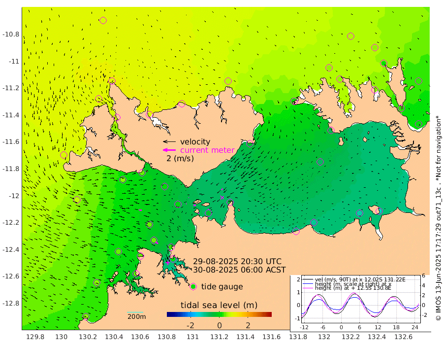 18cm/s -99T +4cm/s rms + 6cm/s 51T. Darwin_C1 52m 17cm/s -94T +4cm/s rms + 7cm/s -161T. Darwin_CW1 22m 3cm/s -104T +4cm/s rms + 8cm/s 61T. Darwin_CW2 34m 27cm/s -137T +3cm/s rms + 9cm/s 98T. Darwin_CW3 22m 32cm/s -90T +5cm/s rms + 7cm/s 88T. Darwin_C3 56m 5cm/s -118T +2cm/s rms + 9cm/s -126T. Darwin_CTbW 22m 42cm/s 96T +1cm/s rms + 1cm/s -47T. DARBGF 30m 47cm/s 129T +4cm/s rms + 3cm/s 80T. NRSDAR 19m 89cm Goodrich Bank 53cm Point Jenny 56cm Native Point 44cm Fish Reef 41cm Tapa Bay 84cm Point Fawcett (Offshore) 42cm Burge Point 47cm Munkunuwa 75cm Beagle A 21cm Parsons Bank 44cm Fenton Patches 8cm Hancox Shoal Area 24cm Nightcliff 12cm Darwin 34cm Charles Point Patches -25cm Glyde Point -85cm Chambers Bay -102cm Point Stuart -41cm Cape Hotham -68cm Christine Reef -121cm West Alligator Head -140cm East Field Island -60cm Two Hills Bay -43cm Camp Point 41cm Medina Inlet South 90cm South Barlow Point 95cm St. Asaph Bay 92cm Cape Van Dieman 90cm Snake Bay 84cm Cache Point 64cm Point Jahleel (Off) 22cm Cape Don 53cm Port Essington 54cm Smith Point - West 51cm NW Peacock Island 62cm North Of Jones Shoal 20cm Peacock Island 25cm Point David 50cm D'urville Point 19cm Copeland Island 27cm One Tree Point