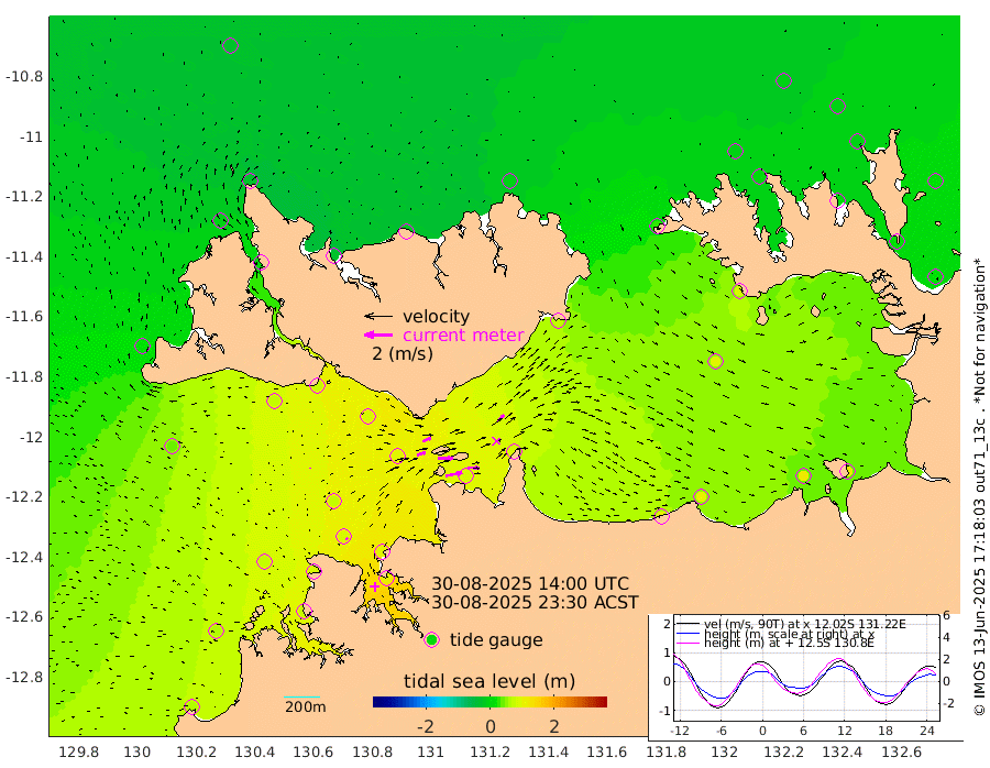 117cm/s 78T +4cm/s rms + 6cm/s 51T. Darwin_C1 52m 82cm/s 93T +4cm/s rms + 7cm/s -161T. Darwin_CW1 22m 64cm/s 71T +4cm/s rms + 8cm/s 61T. Darwin_CW2 34m 61cm/s 48T +3cm/s rms + 9cm/s 98T. Darwin_CW3 22m 106cm/s 89T +5cm/s rms + 7cm/s 88T. Darwin_C3 56m 65cm/s 66T +2cm/s rms + 9cm/s -126T. Darwin_CTbW 22m 5cm/s -11T +1cm/s rms + 1cm/s -47T. DARBGF 30m 14cm/s -31T +4cm/s rms + 3cm/s 80T. NRSDAR 19m -28cm Goodrich Bank 64cm Point Jenny 62cm Native Point 68cm Fish Reef 83cm Tapa Bay 18cm Point Fawcett (Offshore) 75cm Burge Point 70cm Munkunuwa 38cm Beagle A 89cm Parsons Bank 73cm Fenton Patches 100cm Hancox Shoal Area 100cm Nightcliff 103cm Darwin 86cm Charles Point Patches 89cm Glyde Point 103cm Chambers Bay 102cm Point Stuart 85cm Cape Hotham 91cm Christine Reef 115cm West Alligator Head 114cm East Field Island 83cm Two Hills Bay 71cm Camp Point 77cm Medina Inlet South 3cm South Barlow Point -8cm St. Asaph Bay -28cm Cape Van Dieman -24cm Snake Bay -22cm Cache Point -5cm Point Jahleel (Off) 28cm Cape Don -3cm Port Essington 2cm Smith Point - West -2cm NW Peacock Island -9cm North Of Jones Shoal -2cm Peacock Island 12cm Point David 2cm D'urville Point 16cm Copeland Island 12cm One Tree Point