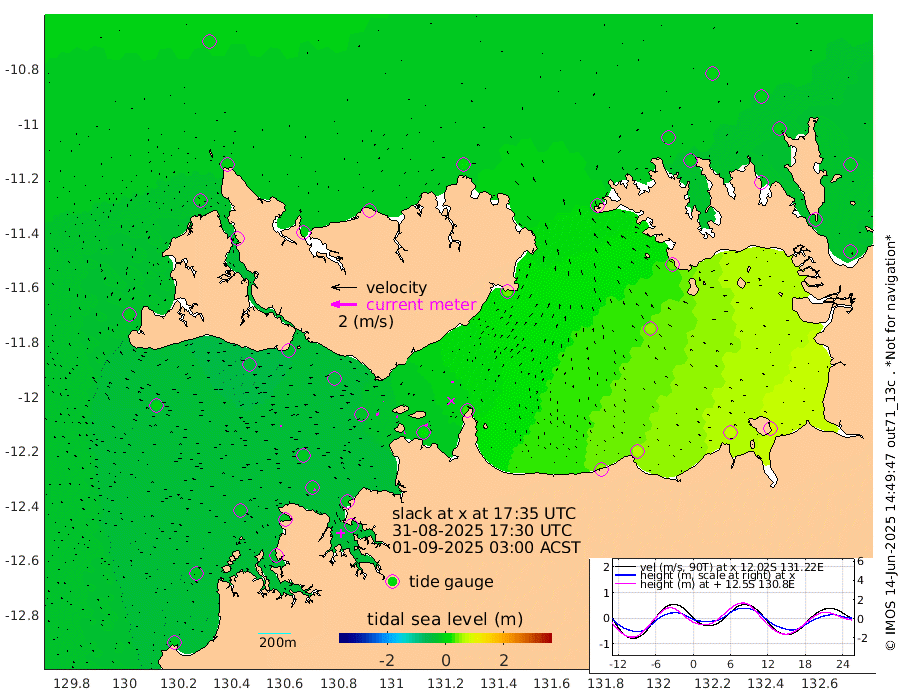 8cm/s -109T +4cm/s rms + 6cm/s 51T. Darwin_C1 52m 23cm/s 91T +4cm/s rms + 7cm/s -161T. Darwin_CW1 22m 22cm/s -113T +4cm/s rms + 8cm/s 61T. Darwin_CW2 34m 8cm/s -1T +3cm/s rms + 9cm/s 98T. Darwin_CW3 22m 12cm/s -100T +5cm/s rms + 7cm/s 88T. Darwin_C3 56m 4cm/s -139T +2cm/s rms + 9cm/s -126T. Darwin_CTbW 22m 15cm/s -90T +1cm/s rms + 1cm/s -47T. DARBGF 30m 15cm/s -65T +4cm/s rms + 3cm/s 80T. NRSDAR 19m -1cm Goodrich Bank -14cm Point Jenny -17cm Native Point -12cm Fish Reef -19cm Tapa Bay -1cm Point Fawcett (Offshore) -26cm Burge Point -37cm Munkunuwa -9cm Beagle A -38cm Parsons Bank -18cm Fenton Patches -23cm Hancox Shoal Area -22cm Nightcliff -27cm Darwin -22cm Charles Point Patches 13cm Glyde Point 54cm Chambers Bay 64cm Point Stuart 26cm Cape Hotham 46cm Christine Reef 75cm West Alligator Head 95cm East Field Island 41cm Two Hills Bay 35cm Camp Point -25cm Medina Inlet South -22cm South Barlow Point -6cm St. Asaph Bay -4cm Cape Van Dieman -10cm Snake Bay 5cm Cache Point 3cm Point Jahleel (Off) 4cm Cape Don -7cm Port Essington -7cm Smith Point - West -9cm NW Peacock Island -1cm North Of Jones Shoal -2cm Peacock Island -17cm Point David -13cm D'urville Point -17cm Copeland Island -13cm One Tree Point