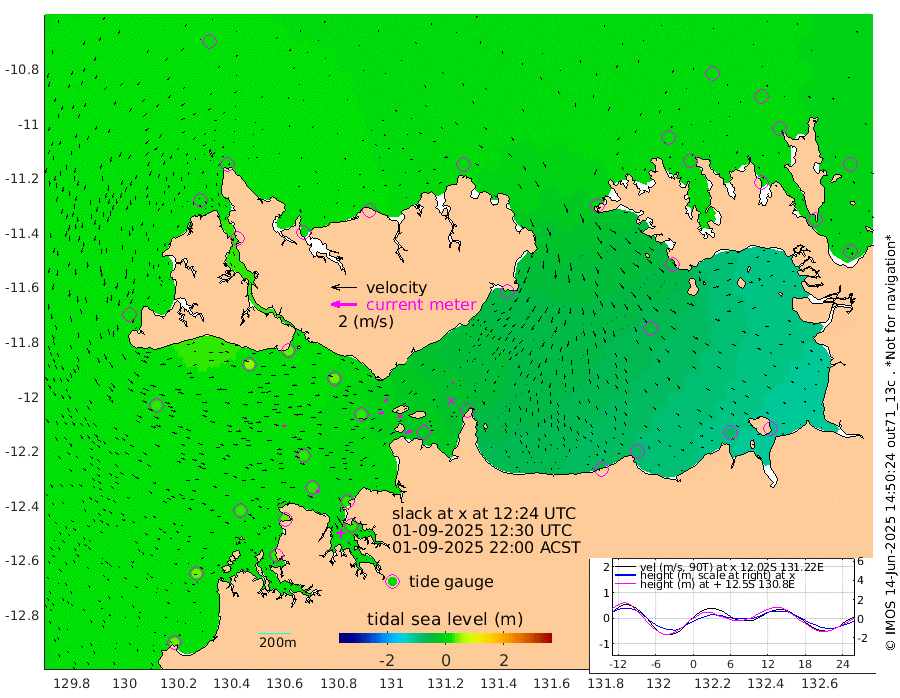 49cm/s 77T +4cm/s rms + 6cm/s 51T. Darwin_C1 52m 5cm/s 104T +4cm/s rms + 7cm/s -161T. Darwin_CW1 22m 34cm/s 72T +4cm/s rms + 8cm/s 61T. Darwin_CW2 34m 9cm/s 107T +3cm/s rms + 9cm/s 98T. Darwin_CW3 22m 31cm/s 85T +5cm/s rms + 7cm/s 88T. Darwin_C3 56m 33cm/s 63T +2cm/s rms + 9cm/s -126T. Darwin_CTbW 22m 27cm/s 91T +1cm/s rms + 1cm/s -47T. DARBGF 30m 27cm/s 115T +4cm/s rms + 3cm/s 80T. NRSDAR 19m 10cm Goodrich Bank 34cm Point Jenny 36cm Native Point 25cm Fish Reef 36cm Tapa Bay 20cm Point Fawcett (Offshore) 32cm Burge Point 52cm Munkunuwa 26cm Beagle A 41cm Parsons Bank 29cm Fenton Patches 32cm Hancox Shoal Area 33cm Nightcliff 28cm Darwin 29cm Charles Point Patches -13cm Glyde Point -53cm Chambers Bay -68cm Point Stuart -30cm Cape Hotham -37cm Christine Reef -76cm West Alligator Head -99cm East Field Island -43cm Two Hills Bay -42cm Camp Point 35cm Medina Inlet South 31cm South Barlow Point 22cm St. Asaph Bay 12cm Cape Van Dieman 11cm Snake Bay 5cm Cache Point 3cm Point Jahleel (Off) -5cm Cape Don 3cm Port Essington 10cm Smith Point - West 5cm NW Peacock Island 0cm North Of Jones Shoal 0cm Peacock Island -6cm Point David 8cm D'urville Point -6cm Copeland Island -8cm One Tree Point
