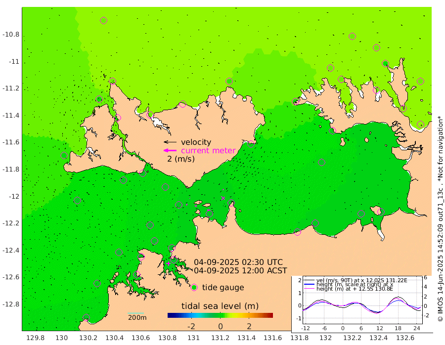 13cm/s -99T +4cm/s rms + 6cm/s 51T. Darwin_C1 52m 42cm/s -91T +4cm/s rms + 7cm/s -161T. Darwin_CW1 22m 18cm/s -109T +4cm/s rms + 8cm/s 61T. Darwin_CW2 34m 16cm/s -140T +3cm/s rms + 9cm/s 98T. Darwin_CW3 22m 28cm/s -93T +5cm/s rms + 7cm/s 88T. Darwin_C3 56m 1cm/s -61T +2cm/s rms + 9cm/s -126T. Darwin_CTbW 22m 2cm/s -149T +1cm/s rms + 1cm/s -47T. DARBGF 30m 2cm/s -98T +4cm/s rms + 3cm/s 80T. NRSDAR 19m 37cm Goodrich Bank -12cm Point Jenny -10cm Native Point -23cm Fish Reef -15cm Tapa Bay 9cm Point Fawcett (Offshore) -26cm Burge Point -22cm Munkunuwa -12cm Beagle A -15cm Parsons Bank -27cm Fenton Patches -16cm Hancox Shoal Area -29cm Nightcliff -25cm Darwin -18cm Charles Point Patches -16cm Glyde Point -20cm Chambers Bay -17cm Point Stuart -12cm Cape Hotham -13cm Christine Reef -23cm West Alligator Head -27cm East Field Island -4cm Two Hills Bay -7cm Camp Point -21cm Medina Inlet South 18cm South Barlow Point 20cm St. Asaph Bay 38cm Cape Van Dieman 41cm Snake Bay 37cm Cache Point 32cm Point Jahleel (Off) 21cm Cape Don 37cm Port Essington 38cm Smith Point - West 43cm NW Peacock Island 36cm North Of Jones Shoal 13cm Peacock Island 51cm Point David 43cm D'urville Point 49cm Copeland Island 45cm One Tree Point
