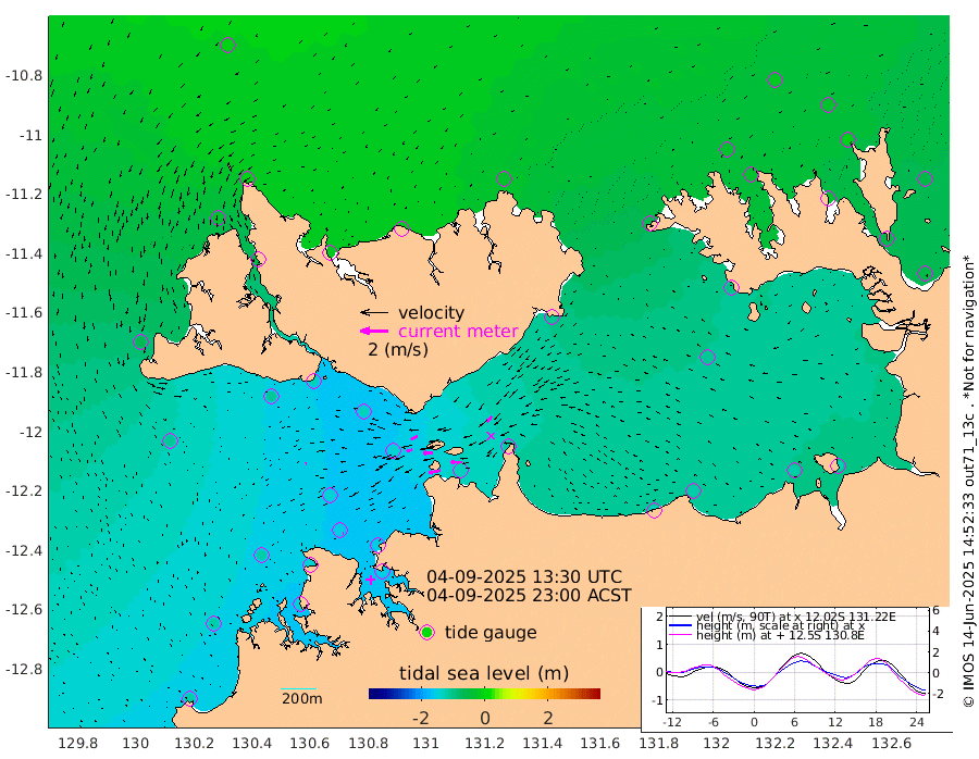88cm/s -102T +4cm/s rms + 6cm/s 51T. Darwin_C1 52m 80cm/s -92T +4cm/s rms + 7cm/s -161T. Darwin_CW1 22m 42cm/s -105T +4cm/s rms + 8cm/s 61T. Darwin_CW2 34m 56cm/s -140T +3cm/s rms + 9cm/s 98T. Darwin_CW3 22m 69cm/s -89T +5cm/s rms + 7cm/s 88T. Darwin_C3 56m 51cm/s -116T +2cm/s rms + 9cm/s -126T. Darwin_CTbW 22m 10cm/s -111T +1cm/s rms + 1cm/s -47T. DARBGF 30m 5cm/s -95T +4cm/s rms + 3cm/s 80T. NRSDAR 19m -10cm Goodrich Bank -118cm Point Jenny -118cm Native Point -123cm Fish Reef -137cm Tapa Bay -63cm Point Fawcett (Offshore) -139cm Burge Point -106cm Munkunuwa -103cm Beagle A -129cm Parsons Bank -139cm Fenton Patches -140cm Hancox Shoal Area -148cm Nightcliff -157cm Darwin -148cm Charles Point Patches -130cm Glyde Point -125cm Chambers Bay -116cm Point Stuart -115cm Cape Hotham -107cm Christine Reef -122cm West Alligator Head -125cm East Field Island -99cm Two Hills Bay -111cm Camp Point -126cm Medina Inlet South -45cm South Barlow Point -32cm St. Asaph Bay -11cm Cape Van Dieman -16cm Snake Bay -16cm Cache Point -26cm Point Jahleel (Off) -59cm Cape Don -32cm Port Essington -28cm Smith Point - West -28cm NW Peacock Island -20cm North Of Jones Shoal -8cm Peacock Island -48cm Point David -31cm D'urville Point -49cm Copeland Island -45cm One Tree Point