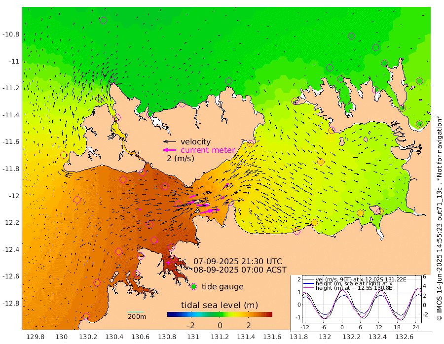 204cm/s 78T +4cm/s rms + 6cm/s 51T. Darwin_C1 52m 156cm/s 93T +4cm/s rms + 7cm/s -161T. Darwin_CW1 22m 128cm/s 72T +4cm/s rms + 8cm/s 61T. Darwin_CW2 34m 119cm/s 45T +3cm/s rms + 9cm/s 98T. Darwin_CW3 22m 196cm/s 89T +5cm/s rms + 7cm/s 88T. Darwin_C3 56m 101cm/s 66T +2cm/s rms + 9cm/s -126T. Darwin_CTbW 22m 33cm/s 75T +1cm/s rms + 1cm/s -47T. DARBGF 30m 25cm/s 97T +4cm/s rms + 3cm/s 80T. NRSDAR 19m -10cm Goodrich Bank 221cm Point Jenny 221cm Native Point 233cm Fish Reef 252cm Tapa Bay 101cm Point Fawcett (Offshore) 279cm Burge Point 242cm Munkunuwa 192cm Beagle A 265cm Parsons Bank 266cm Fenton Patches 260cm Hancox Shoal Area 286cm Nightcliff 296cm Darwin 263cm Charles Point Patches 208cm Glyde Point 159cm Chambers Bay 142cm Point Stuart 169cm Cape Hotham 148cm Christine Reef 152cm West Alligator Head 135cm East Field Island 129cm Two Hills Bay 139cm Camp Point 249cm Medina Inlet South 87cm South Barlow Point 48cm St. Asaph Bay -6cm Cape Van Dieman 3cm Snake Bay -5cm Cache Point 18cm Point Jahleel (Off) 73cm Cape Don 20cm Port Essington 20cm Smith Point - West 13cm NW Peacock Island -1cm North Of Jones Shoal 1cm Peacock Island 28cm Point David 19cm D'urville Point 30cm Copeland Island 29cm One Tree Point