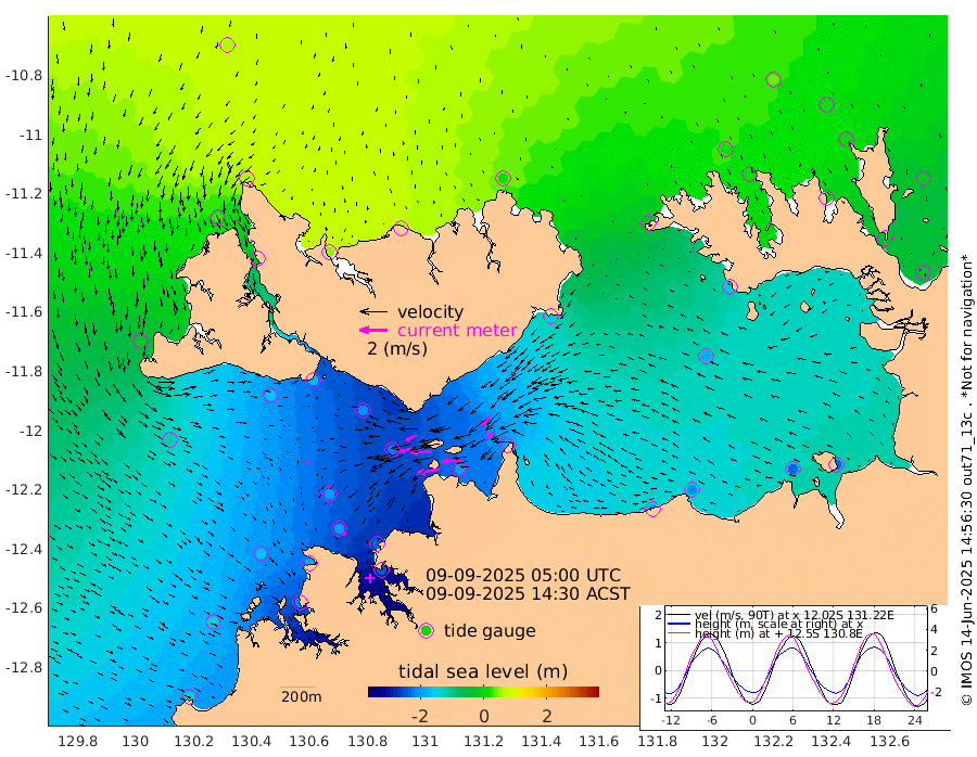 164cm/s -101T +4cm/s rms + 6cm/s 51T. Darwin_C1 52m 136cm/s -92T +4cm/s rms + 7cm/s -161T. Darwin_CW1 22m 84cm/s -106T +4cm/s rms + 8cm/s 61T. Darwin_CW2 34m 100cm/s -137T +3cm/s rms + 9cm/s 98T. Darwin_CW3 22m 150cm/s -91T +5cm/s rms + 7cm/s 88T. Darwin_C3 56m 84cm/s -116T +2cm/s rms + 9cm/s -126T. Darwin_CTbW 22m 16cm/s 125T +1cm/s rms + 1cm/s -47T. DARBGF 30m 26cm/s 148T +4cm/s rms + 3cm/s 80T. NRSDAR 19m 62cm Goodrich Bank -143cm Point Jenny -142cm Native Point -161cm Fish Reef -181cm Tapa Bay -22cm Point Fawcett (Offshore) -208cm Burge Point -163cm Munkunuwa -114cm Beagle A -210cm Parsons Bank -201cm Fenton Patches -219cm Hancox Shoal Area -228cm Nightcliff -244cm Darwin -198cm Charles Point Patches -202cm Glyde Point -201cm Chambers Bay -204cm Point Stuart -187cm Cape Hotham -183cm Christine Reef -226cm West Alligator Head -232cm East Field Island -161cm Two Hills Bay -161cm Camp Point -176cm Medina Inlet South -11cm South Barlow Point 24cm St. Asaph Bay 62cm Cape Van Dieman 50cm Snake Bay 55cm Cache Point 20cm Point Jahleel (Off) -49cm Cape Don 13cm Port Essington 12cm Smith Point - West 13cm NW Peacock Island 37cm North Of Jones Shoal 10cm Peacock Island -25cm Point David 7cm D'urville Point -31cm Copeland Island -19cm One Tree Point