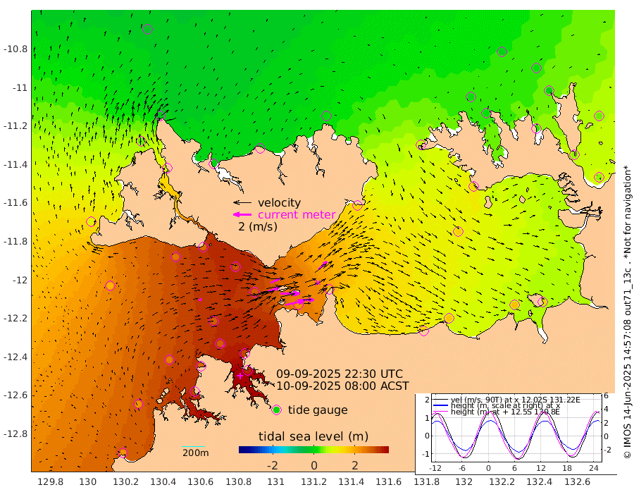 219cm/s 78T +4cm/s rms + 6cm/s 51T. Darwin_C1 52m 167cm/s 92T +4cm/s rms + 7cm/s -161T. Darwin_CW1 22m 137cm/s 73T +4cm/s rms + 8cm/s 61T. Darwin_CW2 34m 129cm/s 45T +3cm/s rms + 9cm/s 98T. Darwin_CW3 22m 218cm/s 89T +5cm/s rms + 7cm/s 88T. Darwin_C3 56m 106cm/s 66T +2cm/s rms + 9cm/s -126T. Darwin_CTbW 22m 30cm/s 72T +1cm/s rms + 1cm/s -47T. DARBGF 30m 24cm/s 90T +4cm/s rms + 3cm/s 80T. NRSDAR 19m -23cm Goodrich Bank 224cm Point Jenny 225cm Native Point 242cm Fish Reef 262cm Tapa Bay 92cm Point Fawcett (Offshore) 293cm Burge Point 257cm Munkunuwa 190cm Beagle A 290cm Parsons Bank 277cm Fenton Patches 280cm Hancox Shoal Area 298cm Nightcliff 318cm Darwin 275cm Charles Point Patches 225cm Glyde Point 168cm Chambers Bay 160cm Point Stuart 187cm Cape Hotham 155cm Christine Reef 171cm West Alligator Head 150cm East Field Island 145cm Two Hills Bay 148cm Camp Point 261cm Medina Inlet South 83cm South Barlow Point 35cm St. Asaph Bay -17cm Cape Van Dieman -3cm Snake Bay -16cm Cache Point 13cm Point Jahleel (Off) 77cm Cape Don 22cm Port Essington 22cm Smith Point - West 17cm NW Peacock Island -8cm North Of Jones Shoal 0cm Peacock Island 48cm Point David 26cm D'urville Point 50cm Copeland Island 43cm One Tree Point