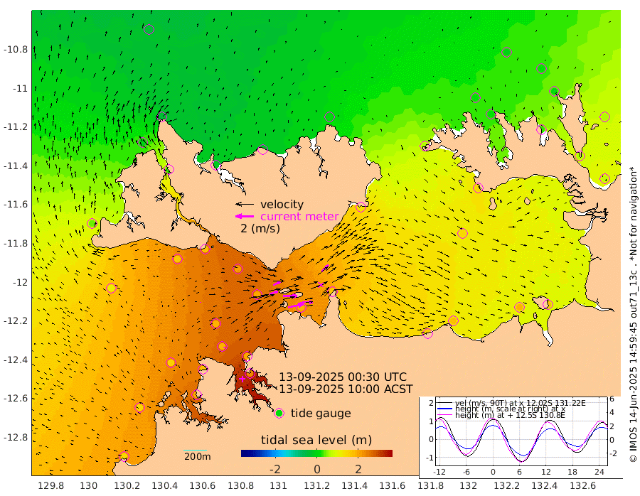 171cm/s 78T +4cm/s rms + 6cm/s 51T. Darwin_C1 52m 117cm/s 92T +4cm/s rms + 7cm/s -161T. Darwin_CW1 22m 95cm/s 73T +4cm/s rms + 8cm/s 61T. Darwin_CW2 34m 104cm/s 43T +3cm/s rms + 9cm/s 98T. Darwin_CW3 22m 158cm/s 89T +5cm/s rms + 7cm/s 88T. Darwin_C3 56m 85cm/s 65T +2cm/s rms + 9cm/s -126T. Darwin_CTbW 22m 8cm/s 3T +1cm/s rms + 1cm/s -47T. DARBGF 30m 14cm/s -7T +4cm/s rms + 3cm/s 80T. NRSDAR 19m -38cm Goodrich Bank 138cm Point Jenny 137cm Native Point 157cm Fish Reef 170cm Tapa Bay 35cm Point Fawcett (Offshore) 194cm Burge Point 161cm Munkunuwa 107cm Beagle A 208cm Parsons Bank 181cm Fenton Patches 202cm Hancox Shoal Area 199cm Nightcliff 228cm Darwin 188cm Charles Point Patches 181cm Glyde Point 160cm Chambers Bay 170cm Point Stuart 165cm Cape Hotham 145cm Christine Reef 184cm West Alligator Head 176cm East Field Island 145cm Two Hills Bay 134cm Camp Point 170cm Medina Inlet South 32cm South Barlow Point -8cm St. Asaph Bay -34cm Cape Van Dieman -20cm Snake Bay -29cm Cache Point 1cm Point Jahleel (Off) 66cm Cape Don 20cm Port Essington 19cm Smith Point - West 22cm NW Peacock Island -11cm North Of Jones Shoal 0cm Peacock Island 66cm Point David 31cm D'urville Point 70cm Copeland Island 57cm One Tree Point