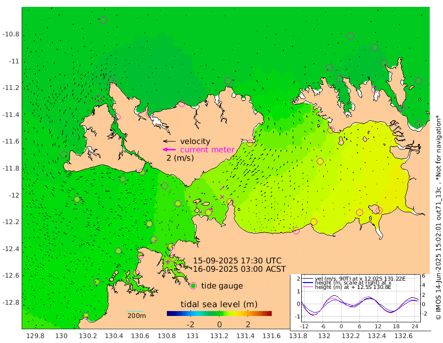 37cm/s 79T +4cm/s rms + 6cm/s 51T. Darwin_C1 52m 51cm/s 91T +4cm/s rms + 7cm/s -161T. Darwin_CW1 22m 4cm/s 89T +4cm/s rms + 8cm/s 61T. Darwin_CW2 34m 34cm/s 37T +3cm/s rms + 9cm/s 98T. Darwin_CW3 22m 22cm/s 95T +5cm/s rms + 7cm/s 88T. Darwin_C3 56m 23cm/s 69T +2cm/s rms + 9cm/s -126T. Darwin_CTbW 22m 15cm/s -79T +1cm/s rms + 1cm/s -47T. DARBGF 30m 16cm/s -55T +4cm/s rms + 3cm/s 80T. NRSDAR 19m -7cm Goodrich Bank 48cm Point Jenny 45cm Native Point 41cm Fish Reef 46cm Tapa Bay 17cm Point Fawcett (Offshore) 55cm Burge Point 23cm Munkunuwa 43cm Beagle A 32cm Parsons Bank 55cm Fenton Patches 47cm Hancox Shoal Area 57cm Nightcliff 45cm Darwin 39cm Charles Point Patches 68cm Glyde Point 105cm Chambers Bay 108cm Point Stuart 72cm Cape Hotham 104cm Christine Reef 122cm West Alligator Head 141cm East Field Island 77cm Two Hills Bay 80cm Camp Point 34cm Medina Inlet South -5cm South Barlow Point 1cm St. Asaph Bay -10cm Cape Van Dieman -16cm Snake Bay 0cm Cache Point 4cm Point Jahleel (Off) 24cm Cape Don -7cm Port Essington -6cm Smith Point - West -8cm NW Peacock Island -6cm North Of Jones Shoal -3cm Peacock Island -12cm Point David -11cm D'urville Point -11cm Copeland Island -8cm One Tree Point