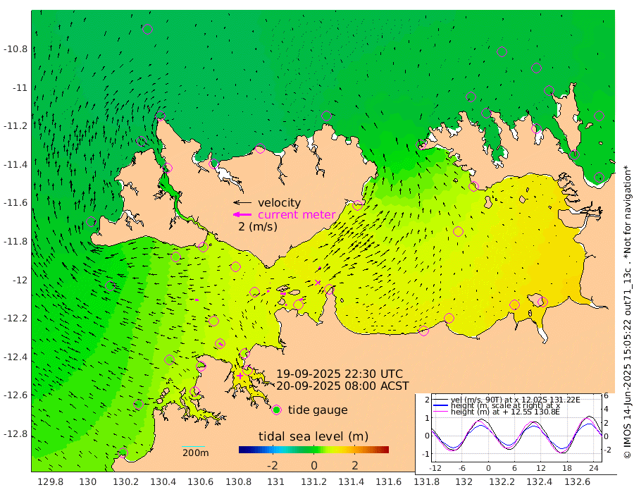 14cm/s 78T +4cm/s rms + 6cm/s 51T. Darwin_C1 52m 41cm/s 89T +4cm/s rms + 7cm/s -161T. Darwin_CW1 22m 23cm/s 74T +4cm/s rms + 8cm/s 61T. Darwin_CW2 34m 34cm/s 37T +3cm/s rms + 9cm/s 98T. Darwin_CW3 22m 61cm/s 91T +5cm/s rms + 7cm/s 88T. Darwin_C3 56m 1cm/s -172T +2cm/s rms + 9cm/s -126T. Darwin_CTbW 22m 40cm/s -80T +1cm/s rms + 1cm/s -47T. DARBGF 30m 47cm/s -51T +4cm/s rms + 3cm/s 80T. NRSDAR 19m -43cm Goodrich Bank 30cm Point Jenny 31cm Native Point 35cm Fish Reef 49cm Tapa Bay -26cm Point Fawcett (Offshore) 71cm Burge Point 40cm Munkunuwa 12cm Beagle A 63cm Parsons Bank 58cm Fenton Patches 72cm Hancox Shoal Area 66cm Nightcliff 87cm Darwin 64cm Charles Point Patches 93cm Glyde Point 123cm Chambers Bay 132cm Point Stuart 91cm Cape Hotham 111cm Christine Reef 150cm West Alligator Head 171cm East Field Island 89cm Two Hills Bay 100cm Camp Point 48cm Medina Inlet South -31cm South Barlow Point -40cm St. Asaph Bay -48cm Cape Van Dieman -45cm Snake Bay -44cm Cache Point -28cm Point Jahleel (Off) 8cm Cape Don -29cm Port Essington -37cm Smith Point - West -34cm NW Peacock Island -43cm North Of Jones Shoal -15cm Peacock Island -16cm Point David -37cm D'urville Point -15cm Copeland Island -18cm One Tree Point