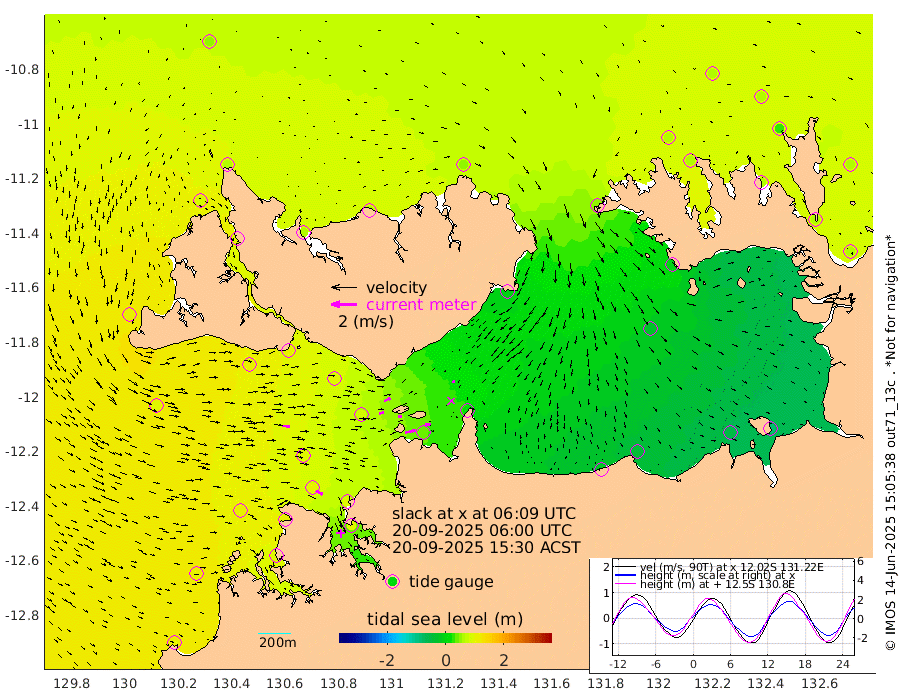 83cm/s 78T +4cm/s rms + 6cm/s 51T. Darwin_C1 52m 48cm/s 84T +4cm/s rms + 7cm/s -161T. Darwin_CW1 22m 35cm/s 77T +4cm/s rms + 8cm/s 61T. Darwin_CW2 34m 21cm/s 61T +3cm/s rms + 9cm/s 98T. Darwin_CW3 22m 33cm/s 86T +5cm/s rms + 7cm/s 88T. Darwin_C3 56m 52cm/s 63T +2cm/s rms + 9cm/s -126T. Darwin_CTbW 22m 59cm/s 93T +1cm/s rms + 1cm/s -47T. DARBGF 30m 60cm/s 122T +4cm/s rms + 3cm/s 80T. NRSDAR 19m 53cm Goodrich Bank 108cm Point Jenny 106cm Native Point 111cm Fish Reef 108cm Tapa Bay 106cm Point Fawcett (Offshore) 96cm Burge Point 106cm Munkunuwa 101cm Beagle A 97cm Parsons Bank 93cm Fenton Patches 85cm Hancox Shoal Area 96cm Nightcliff 92cm Darwin 103cm Charles Point Patches 37cm Glyde Point -19cm Chambers Bay -35cm Point Stuart 20cm Cape Hotham -25cm Christine Reef -50cm West Alligator Head -82cm East Field Island 0cm Two Hills Bay -6cm Camp Point 105cm Medina Inlet South 92cm South Barlow Point 82cm St. Asaph Bay 62cm Cape Van Dieman 64cm Snake Bay 61cm Cache Point 54cm Point Jahleel (Off) 52cm Cape Don 63cm Port Essington 65cm Smith Point - West 61cm NW Peacock Island 63cm North Of Jones Shoal 23cm Peacock Island 64cm Point David 67cm D'urville Point 62cm Copeland Island 64cm One Tree Point