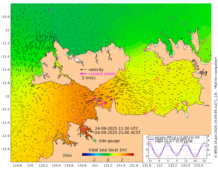 160cm/s 79T +4cm/s rms + 6cm/s 51T. Darwin_C1 52m 133cm/s 92T +4cm/s rms + 7cm/s -161T. Darwin_CW1 22m 102cm/s 71T +4cm/s rms + 8cm/s 61T. Darwin_CW2 34m 91cm/s 47T +3cm/s rms + 9cm/s 98T. Darwin_CW3 22m 174cm/s 89T +5cm/s rms + 7cm/s 88T. Darwin_C3 56m 75cm/s 66T +2cm/s rms + 9cm/s -126T. Darwin_CTbW 22m 11cm/s -24T +1cm/s rms + 1cm/s -47T. DARBGF 30m 28cm/s -40T +4cm/s rms + 3cm/s 80T. NRSDAR 19m -42cm Goodrich Bank 135cm Point Jenny 131cm Native Point 158cm Fish Reef 170cm Tapa Bay 48cm Point Fawcett (Offshore) 183cm Burge Point 157cm Munkunuwa 98cm Beagle A 193cm Parsons Bank 168cm Fenton Patches 199cm Hancox Shoal Area 199cm Nightcliff 225cm Darwin 191cm Charles Point Patches 182cm Glyde Point 183cm Chambers Bay 191cm Point Stuart 174cm Cape Hotham 158cm Christine Reef 210cm West Alligator Head 208cm East Field Island 156cm Two Hills Bay 142cm Camp Point 171cm Medina Inlet South 24cm South Barlow Point -2cm St. Asaph Bay -41cm Cape Van Dieman -31cm Snake Bay -30cm Cache Point -2cm Point Jahleel (Off) 60cm Cape Don 8cm Port Essington 6cm Smith Point - West 3cm NW Peacock Island -9cm North Of Jones Shoal -1cm Peacock Island 36cm Point David 9cm D'urville Point 41cm Copeland Island 35cm One Tree Point