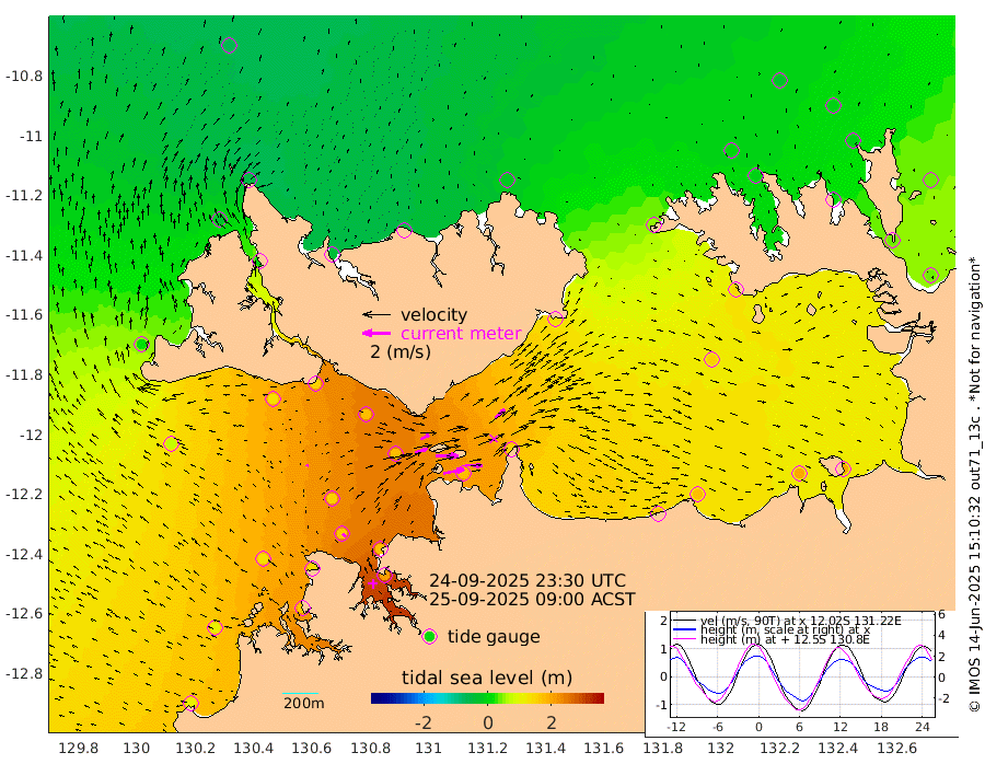 150cm/s 79T +4cm/s rms + 6cm/s 51T. Darwin_C1 52m 122cm/s 93T +4cm/s rms + 7cm/s -161T. Darwin_CW1 22m 93cm/s 71T +4cm/s rms + 8cm/s 61T. Darwin_CW2 34m 96cm/s 45T +3cm/s rms + 9cm/s 98T. Darwin_CW3 22m 163cm/s 90T +5cm/s rms + 7cm/s 88T. Darwin_C3 56m 69cm/s 65T +2cm/s rms + 9cm/s -126T. Darwin_CTbW 22m 16cm/s -55T +1cm/s rms + 1cm/s -47T. DARBGF 30m 31cm/s -40T +4cm/s rms + 3cm/s 80T. NRSDAR 19m -57cm Goodrich Bank 107cm Point Jenny 105cm Native Point 134cm Fish Reef 138cm Tapa Bay 14cm Point Fawcett (Offshore) 165cm Burge Point 130cm Munkunuwa 77cm Beagle A 176cm Parsons Bank 151cm Fenton Patches 175cm Hancox Shoal Area 173cm Nightcliff 207cm Darwin 168cm Charles Point Patches 171cm Glyde Point 169cm Chambers Bay 180cm Point Stuart 157cm Cape Hotham 147cm Christine Reef 197cm West Alligator Head 200cm East Field Island 144cm Two Hills Bay 135cm Camp Point 147cm Medina Inlet South 7cm South Barlow Point -28cm St. Asaph Bay -56cm Cape Van Dieman -43cm Snake Bay -48cm Cache Point -19cm Point Jahleel (Off) 52cm Cape Don 2cm Port Essington -3cm Smith Point - West -2cm NW Peacock Island -23cm North Of Jones Shoal -5cm Peacock Island 35cm Point David 4cm D'urville Point 40cm Copeland Island 34cm One Tree Point