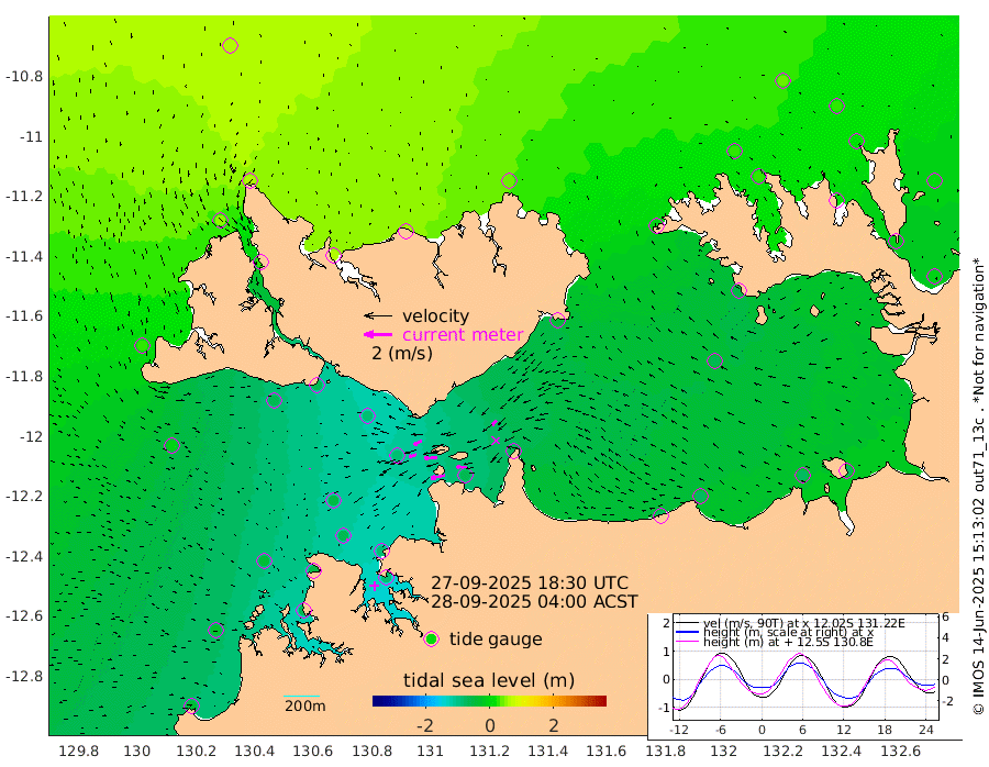 105cm/s -101T +4cm/s rms + 6cm/s 51T. Darwin_C1 52m 71cm/s -90T +4cm/s rms + 7cm/s -161T. Darwin_CW1 22m 57cm/s -107T +4cm/s rms + 8cm/s 61T. Darwin_CW2 34m 49cm/s -134T +3cm/s rms + 9cm/s 98T. Darwin_CW3 22m 90cm/s -91T +5cm/s rms + 7cm/s 88T. Darwin_C3 56m 62cm/s -115T +2cm/s rms + 9cm/s -126T. Darwin_CTbW 22m 4cm/s 172T +1cm/s rms + 1cm/s -47T. DARBGF 30m 10cm/s -179T +4cm/s rms + 3cm/s 80T. NRSDAR 19m 64cm Goodrich Bank -35cm Point Jenny -34cm Native Point -44cm Fish Reef -55cm Tapa Bay 25cm Point Fawcett (Offshore) -60cm Burge Point -57cm Munkunuwa -8cm Beagle A -82cm Parsons Bank -54cm Fenton Patches -84cm Hancox Shoal Area -82cm Nightcliff -90cm Darwin -63cm Charles Point Patches -66cm Glyde Point -70cm Chambers Bay -69cm Point Stuart -59cm Cape Hotham -61cm Christine Reef -79cm West Alligator Head -73cm East Field Island -53cm Two Hills Bay -43cm Camp Point -57cm Medina Inlet South 23cm South Barlow Point 46cm St. Asaph Bay 63cm Cape Van Dieman 56cm Snake Bay 61cm Cache Point 40cm Point Jahleel (Off) -3cm Cape Don 26cm Port Essington 24cm Smith Point - West 24cm NW Peacock Island 39cm North Of Jones Shoal 11cm Peacock Island 0cm Point David 18cm D'urville Point -6cm Copeland Island 2cm One Tree Point