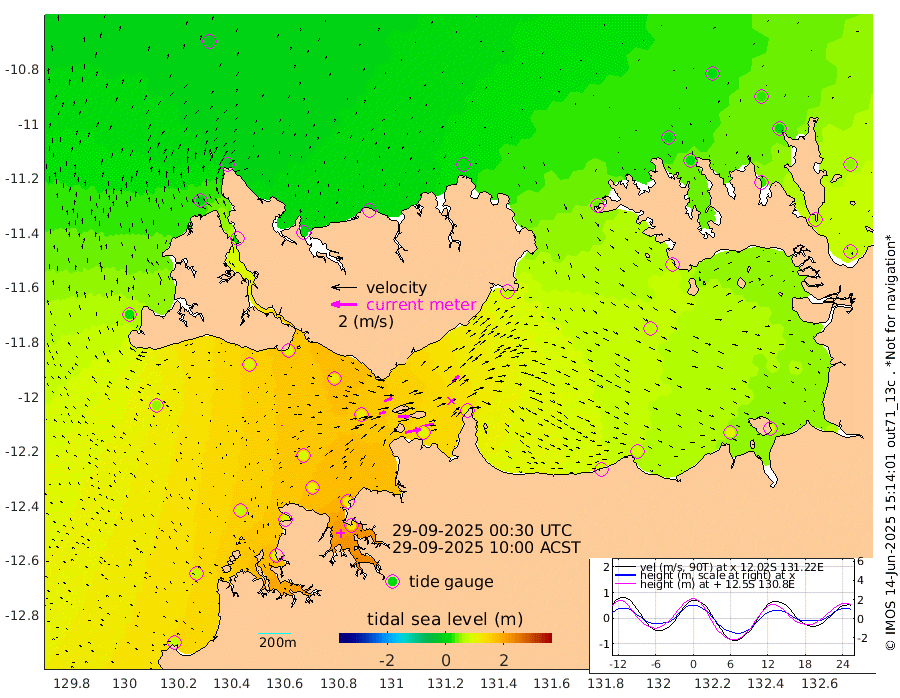 122cm/s 78T +4cm/s rms + 6cm/s 51T. Darwin_C1 52m 67cm/s 89T +4cm/s rms + 7cm/s -161T. Darwin_CW1 22m 52cm/s 75T +4cm/s rms + 8cm/s 61T. Darwin_CW2 34m 72cm/s 44T +3cm/s rms + 9cm/s 98T. Darwin_CW3 22m 86cm/s 90T +5cm/s rms + 7cm/s 88T. Darwin_C3 56m 66cm/s 65T +2cm/s rms + 9cm/s -126T. Darwin_CTbW 22m 4cm/s 8T +1cm/s rms + 1cm/s -47T. DARBGF 30m 9cm/s 5T +4cm/s rms + 3cm/s 80T. NRSDAR 19m -17cm Goodrich Bank 71cm Point Jenny 71cm Native Point 76cm Fish Reef 93cm Tapa Bay 18cm Point Fawcett (Offshore) 100cm Burge Point 85cm Munkunuwa 47cm Beagle A 118cm Parsons Bank 90cm Fenton Patches 118cm Hancox Shoal Area 118cm Nightcliff 130cm Darwin 106cm Charles Point Patches 99cm Glyde Point 86cm Chambers Bay 87cm Point Stuart 91cm Cape Hotham 78cm Christine Reef 92cm West Alligator Head 85cm East Field Island 80cm Two Hills Bay 76cm Camp Point 93cm Medina Inlet South 22cm South Barlow Point -3cm St. Asaph Bay -14cm Cape Van Dieman 0cm Snake Bay -13cm Cache Point 6cm Point Jahleel (Off) 44cm Cape Don 21cm Port Essington 21cm Smith Point - West 25cm NW Peacock Island 9cm North Of Jones Shoal 6cm Peacock Island 61cm Point David 31cm D'urville Point 63cm Copeland Island 54cm One Tree Point