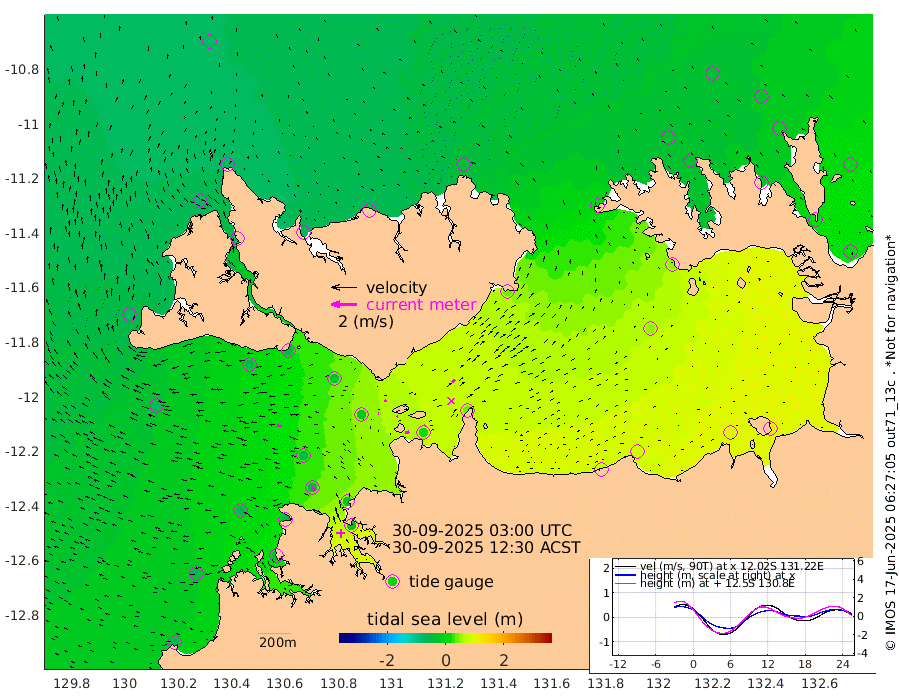 30cm/s 80T +4cm/s rms + 6cm/s 51T. Darwin_C1 52m 2cm/s 57T +4cm/s rms + 7cm/s -161T. Darwin_CW1 22m 9cm/s -95T +4cm/s rms + 8cm/s 61T. Darwin_CW2 34m 29cm/s 41T +3cm/s rms + 9cm/s 98T. Darwin_CW3 22m 8cm/s -102T +5cm/s rms + 7cm/s 88T. Darwin_C3 56m 19cm/s 64T +2cm/s rms + 9cm/s -126T. Darwin_CTbW 22m 35cm/s -87T +1cm/s rms + 1cm/s -47T. DARBGF 30m 40cm/s -55T +4cm/s rms + 3cm/s 80T. NRSDAR 19m -68cm Goodrich Bank -54cm Point Jenny -57cm Native Point -52cm Fish Reef -46cm Tapa Bay -73cm Point Fawcett (Offshore) -48cm Burge Point -59cm Munkunuwa -68cm Beagle A -28cm Parsons Bank -47cm Fenton Patches -15cm Hancox Shoal Area -21cm Nightcliff -24cm Darwin -44cm Charles Point Patches 16cm Glyde Point 70cm Chambers Bay 84cm Point Stuart 37cm Cape Hotham 56cm Christine Reef 96cm West Alligator Head 114cm East Field Island 53cm Two Hills Bay 40cm Camp Point -49cm Medina Inlet South -74cm South Barlow Point -78cm St. Asaph Bay -69cm Cape Van Dieman -61cm Snake Bay -61cm Cache Point -44cm Point Jahleel (Off) -10cm Cape Don -33cm Port Essington -33cm Smith Point - West -25cm NW Peacock Island -35cm North Of Jones Shoal -10cm Peacock Island 12cm Point David -23cm D'urville Point 17cm Copeland Island 6cm One Tree Point