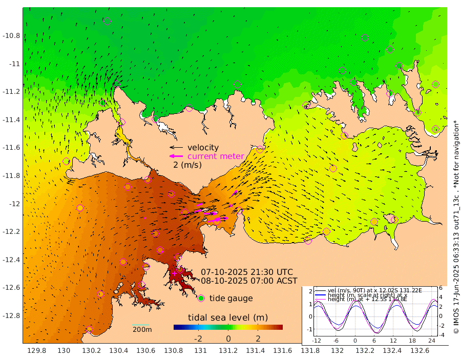 199cm/s 78T +4cm/s rms + 6cm/s 51T. Darwin_C1 52m 156cm/s 92T +4cm/s rms + 7cm/s -161T. Darwin_CW1 22m 123cm/s 73T +4cm/s rms + 8cm/s 61T. Darwin_CW2 34m 118cm/s 44T +3cm/s rms + 9cm/s 98T. Darwin_CW3 22m 196cm/s 89T +5cm/s rms + 7cm/s 88T. Darwin_C3 56m 96cm/s 65T +2cm/s rms + 9cm/s -126T. Darwin_CTbW 22m 24cm/s 69T +1cm/s rms + 1cm/s -47T. DARBGF 30m 18cm/s 84T +4cm/s rms + 3cm/s 80T. NRSDAR 19m -34cm Goodrich Bank 199cm Point Jenny 200cm Native Point 216cm Fish Reef 236cm Tapa Bay 71cm Point Fawcett (Offshore) 266cm Burge Point 230cm Munkunuwa 166cm Beagle A 263cm Parsons Bank 250cm Fenton Patches 255cm Hancox Shoal Area 270cm Nightcliff 291cm Darwin 249cm Charles Point Patches 208cm Glyde Point 157cm Chambers Bay 153cm Point Stuart 174cm Cape Hotham 144cm Christine Reef 163cm West Alligator Head 146cm East Field Island 134cm Two Hills Bay 140cm Camp Point 234cm Medina Inlet South 64cm South Barlow Point 18cm St. Asaph Bay -28cm Cape Van Dieman -15cm Snake Bay -28cm Cache Point 1cm Point Jahleel (Off) 65cm Cape Don 12cm Port Essington 11cm Smith Point - West 8cm NW Peacock Island -18cm North Of Jones Shoal -3cm Peacock Island 44cm Point David 17cm D'urville Point 47cm Copeland Island 37cm One Tree Point