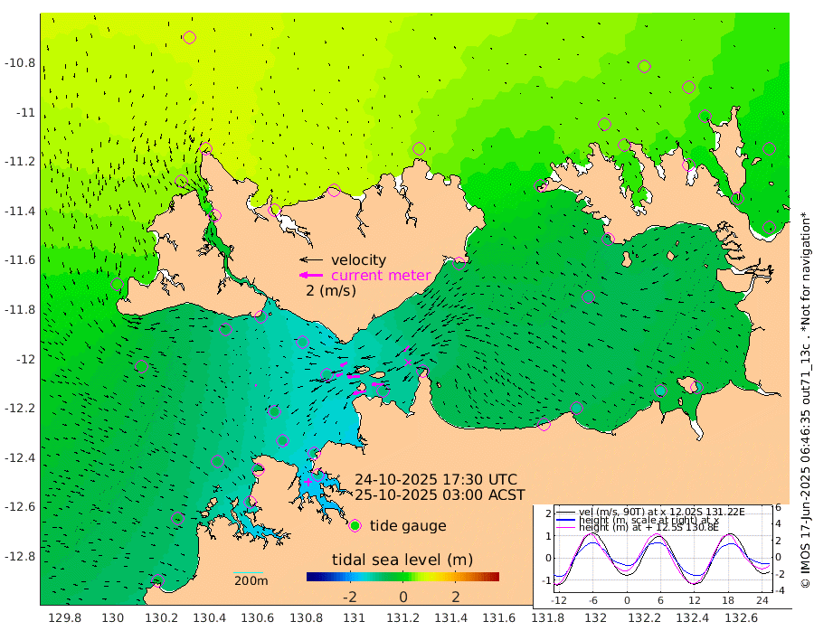 119cm/s -100T +4cm/s rms + 6cm/s 51T. Darwin_C1 52m 104cm/s -91T +4cm/s rms + 7cm/s -161T. Darwin_CW1 22m 58cm/s -106T +4cm/s rms + 8cm/s 61T. Darwin_CW2 34m 64cm/s -135T +3cm/s rms + 9cm/s 98T. Darwin_CW3 22m 107cm/s -91T +5cm/s rms + 7cm/s 88T. Darwin_C3 56m 63cm/s -115T +2cm/s rms + 9cm/s -126T. Darwin_CTbW 22m 10cm/s 124T +1cm/s rms + 1cm/s -47T. DARBGF 30m 16cm/s 157T +4cm/s rms + 3cm/s 80T. NRSDAR 19m 79cm Goodrich Bank -43cm Point Jenny -39cm Native Point -57cm Fish Reef -66cm Tapa Bay 28cm Point Fawcett (Offshore) -74cm Burge Point -67cm Munkunuwa -12cm Beagle A -93cm Parsons Bank -67cm Fenton Patches -97cm Hancox Shoal Area -94cm Nightcliff -108cm Darwin -78cm Charles Point Patches -87cm Glyde Point -98cm Chambers Bay -102cm Point Stuart -81cm Cape Hotham -83cm Christine Reef -117cm West Alligator Head -117cm East Field Island -74cm Two Hills Bay -63cm Camp Point -68cm Medina Inlet South 34cm South Barlow Point 56cm St. Asaph Bay 79cm Cape Van Dieman 74cm Snake Bay 75cm Cache Point 50cm Point Jahleel (Off) -1cm Cape Don 37cm Port Essington 36cm Smith Point - West 38cm NW Peacock Island 53cm North Of Jones Shoal 16cm Peacock Island 13cm Point David 32cm D'urville Point 5cm Copeland Island 14cm One Tree Point