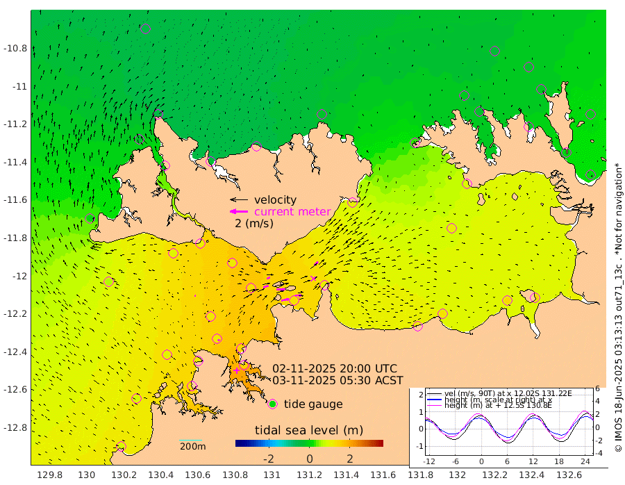 85cm/s 78T +4cm/s rms + 6cm/s 51T. Darwin_C1 52m 73cm/s 94T +4cm/s rms + 7cm/s -161T. Darwin_CW1 22m 59cm/s 71T +4cm/s rms + 8cm/s 61T. Darwin_CW2 34m 61cm/s 43T +3cm/s rms + 9cm/s 98T. Darwin_CW3 22m 99cm/s 90T +5cm/s rms + 7cm/s 88T. Darwin_C3 56m 40cm/s 66T +2cm/s rms + 9cm/s -126T. Darwin_CTbW 22m 12cm/s -57T +1cm/s rms + 1cm/s -47T. DARBGF 30m 19cm/s -41T +4cm/s rms + 3cm/s 80T. NRSDAR 19m -48cm Goodrich Bank 87cm Point Jenny 87cm Native Point 96cm Fish Reef 108cm Tapa Bay 6cm Point Fawcett (Offshore) 132cm Burge Point 98cm Munkunuwa 66cm Beagle A 123cm Parsons Bank 122cm Fenton Patches 127cm Hancox Shoal Area 139cm Nightcliff 149cm Darwin 121cm Charles Point Patches 124cm Glyde Point 125cm Chambers Bay 125cm Point Stuart 109cm Cape Hotham 113cm Christine Reef 139cm West Alligator Head 146cm East Field Island 93cm Two Hills Bay 105cm Camp Point 108cm Medina Inlet South -1cm South Barlow Point -24cm St. Asaph Bay -48cm Cape Van Dieman -42cm Snake Bay -46cm Cache Point -26cm Point Jahleel (Off) 23cm Cape Don -21cm Port Essington -26cm Smith Point - West -26cm NW Peacock Island -37cm North Of Jones Shoal -11cm Peacock Island -3cm Point David -24cm D'urville Point 0cm Copeland Island -4cm One Tree Point