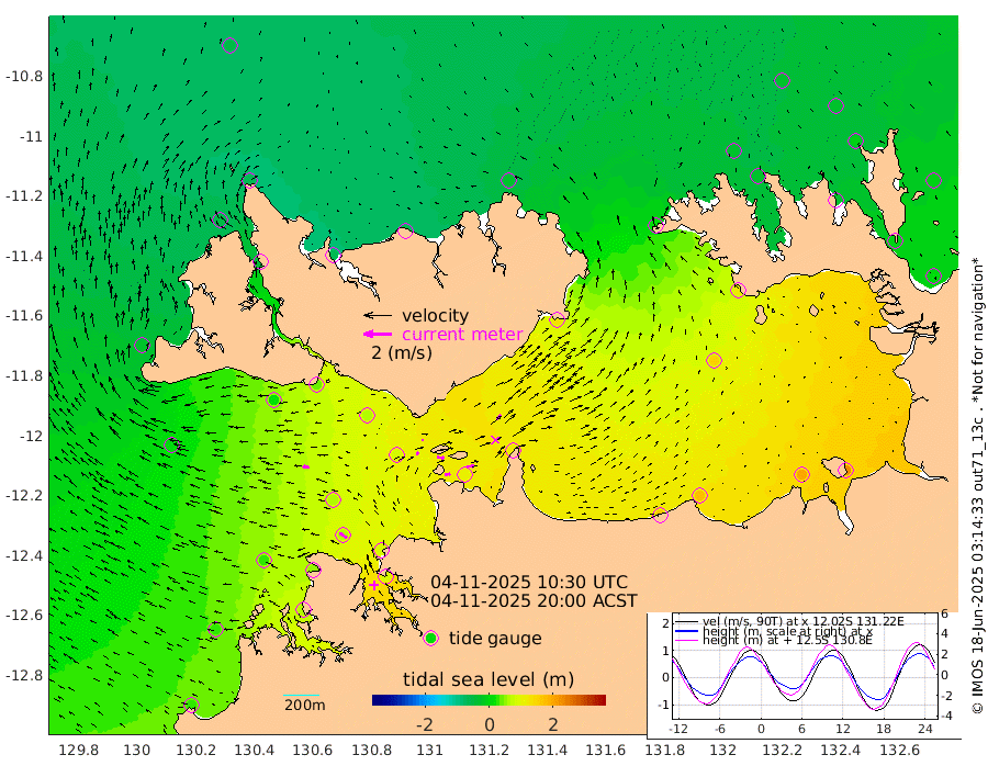 38cm/s 81T +4cm/s rms + 6cm/s 51T. Darwin_C1 52m 52cm/s 89T +4cm/s rms + 7cm/s -161T. Darwin_CW1 22m 19cm/s 68T +4cm/s rms + 8cm/s 61T. Darwin_CW2 34m 45cm/s 40T +3cm/s rms + 9cm/s 98T. Darwin_CW3 22m 52cm/s 92T +5cm/s rms + 7cm/s 88T. Darwin_C3 56m 12cm/s 69T +2cm/s rms + 9cm/s -126T. Darwin_CTbW 22m 49cm/s -81T +1cm/s rms + 1cm/s -47T. DARBGF 30m 64cm/s -53T +4cm/s rms + 3cm/s 80T. NRSDAR 19m -52cm Goodrich Bank 26cm Point Jenny 23cm Native Point 33cm Fish Reef 47cm Tapa Bay -32cm Point Fawcett (Offshore) 60cm Burge Point 18cm Munkunuwa 11cm Beagle A 58cm Parsons Bank 60cm Fenton Patches 83cm Hancox Shoal Area 79cm Nightcliff 89cm Darwin 66cm Charles Point Patches 110cm Glyde Point 164cm Chambers Bay 174cm Point Stuart 119cm Cape Hotham 152cm Christine Reef 197cm West Alligator Head 229cm East Field Island 122cm Two Hills Bay 126cm Camp Point 40cm Medina Inlet South -43cm South Barlow Point -48cm St. Asaph Bay -59cm Cape Van Dieman -56cm Snake Bay -47cm Cache Point -25cm Point Jahleel (Off) 18cm Cape Don -25cm Port Essington -26cm Smith Point - West -23cm NW Peacock Island -32cm North Of Jones Shoal -11cm Peacock Island -2cm Point David -24cm D'urville Point 3cm Copeland Island -3cm One Tree Point
