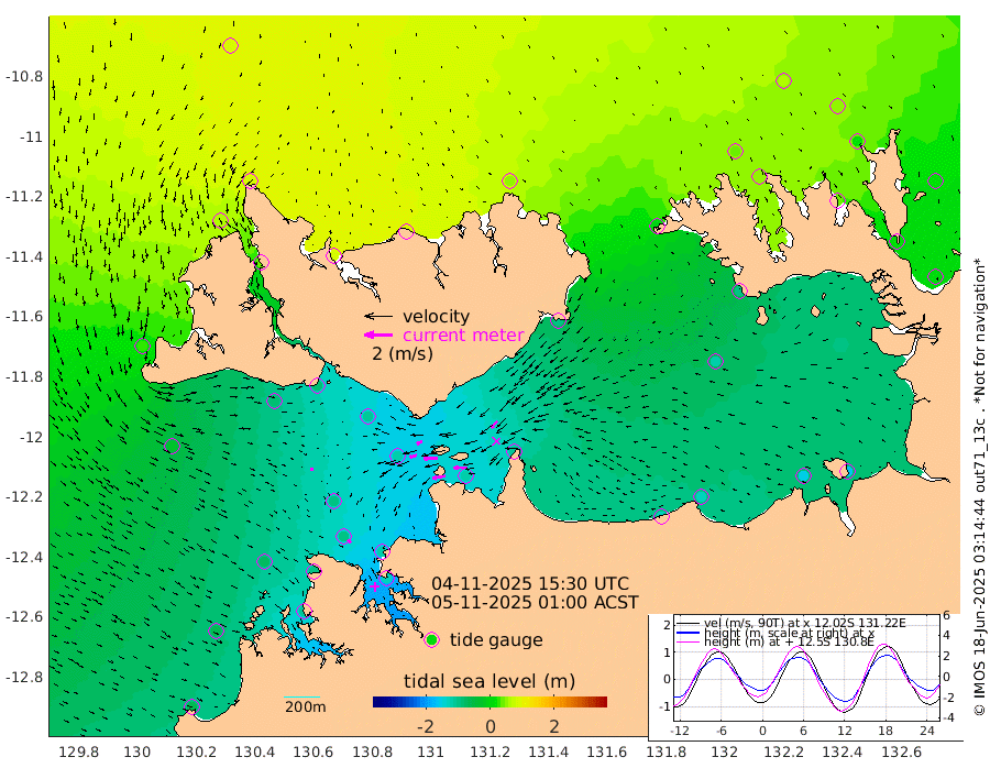 96cm/s -101T +4cm/s rms + 6cm/s 51T. Darwin_C1 52m 93cm/s -92T +4cm/s rms + 7cm/s -161T. Darwin_CW1 22m 51cm/s -106T +4cm/s rms + 8cm/s 61T. Darwin_CW2 34m 66cm/s -136T +3cm/s rms + 9cm/s 98T. Darwin_CW3 22m 101cm/s -90T +5cm/s rms + 7cm/s 88T. Darwin_C3 56m 42cm/s -115T +2cm/s rms + 9cm/s -126T. Darwin_CTbW 22m 23cm/s 109T +1cm/s rms + 1cm/s -47T. DARBGF 30m 29cm/s 139T +4cm/s rms + 3cm/s 80T. NRSDAR 19m 85cm Goodrich Bank -66cm Point Jenny -62cm Native Point -70cm Fish Reef -91cm Tapa Bay 27cm Point Fawcett (Offshore) -107cm Burge Point -82cm Munkunuwa -29cm Beagle A -112cm Parsons Bank -94cm Fenton Patches -123cm Hancox Shoal Area -123cm Nightcliff -132cm Darwin -101cm Charles Point Patches -113cm Glyde Point -134cm Chambers Bay -133cm Point Stuart -106cm Cape Hotham -120cm Christine Reef -151cm West Alligator Head -158cm East Field Island -92cm Two Hills Bay -97cm Camp Point -85cm Medina Inlet South 38cm South Barlow Point 59cm St. Asaph Bay 85cm Cape Van Dieman 83cm Snake Bay 80cm Cache Point 54cm Point Jahleel (Off) -4cm Cape Don 44cm Port Essington 47cm Smith Point - West 47cm NW Peacock Island 62cm North Of Jones Shoal 20cm Peacock Island 15cm Point David 43cm D'urville Point 8cm Copeland Island 19cm One Tree Point