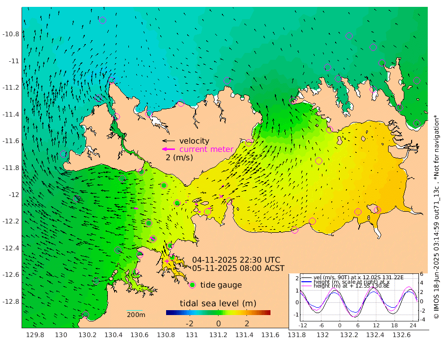 30cm/s 81T +4cm/s rms + 6cm/s 51T. Darwin_C1 52m 42cm/s 91T +4cm/s rms + 7cm/s -161T. Darwin_CW1 22m 11cm/s 53T +4cm/s rms + 8cm/s 61T. Darwin_CW2 34m 46cm/s 43T +3cm/s rms + 9cm/s 98T. Darwin_CW3 22m 39cm/s 93T +5cm/s rms + 7cm/s 88T. Darwin_C3 56m 4cm/s 72T +2cm/s rms + 9cm/s -126T. Darwin_CTbW 22m 68cm/s -84T +1cm/s rms + 1cm/s -47T. DARBGF 30m 81cm/s -54T +4cm/s rms + 3cm/s 80T. NRSDAR 19m -122cm Goodrich Bank -55cm Point Jenny -56cm Native Point -46cm Fish Reef -32cm Tapa Bay -120cm Point Fawcett (Offshore) -11cm Burge Point -38cm Munkunuwa -79cm Beagle A 1cm Parsons Bank -20cm Fenton Patches 15cm Hancox Shoal Area 6cm Nightcliff 22cm Darwin -17cm Charles Point Patches 58cm Glyde Point 119cm Chambers Bay 142cm Point Stuart 71cm Cape Hotham 104cm Christine Reef 166cm West Alligator Head 199cm East Field Island 80cm Two Hills Bay 83cm Camp Point -30cm Medina Inlet South -115cm South Barlow Point -129cm St. Asaph Bay -127cm Cape Van Dieman -119cm Snake Bay -122cm Cache Point -92cm Point Jahleel (Off) -36cm Cape Don -83cm Port Essington -90cm Smith Point - West -83cm NW Peacock Island -98cm North Of Jones Shoal -32cm Peacock Island -40cm Point David -83cm D'urville Point -33cm Copeland Island -46cm One Tree Point