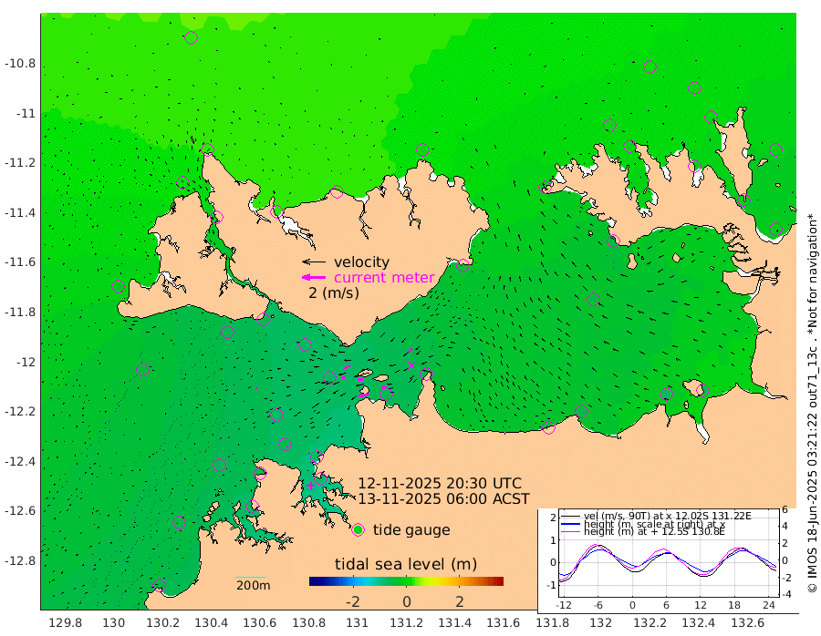 94cm/s -101T +4cm/s rms + 6cm/s 51T. Darwin_C1 52m 46cm/s -91T +4cm/s rms + 7cm/s -161T. Darwin_CW1 22m 35cm/s -107T +4cm/s rms + 8cm/s 61T. Darwin_CW2 34m 44cm/s -134T +3cm/s rms + 9cm/s 98T. Darwin_CW3 22m 46cm/s -91T +5cm/s rms + 7cm/s 88T. Darwin_C3 56m 56cm/s -116T +2cm/s rms + 9cm/s -126T. Darwin_CTbW 22m 13cm/s -96T +1cm/s rms + 1cm/s -47T. DARBGF 30m 13cm/s -76T +4cm/s rms + 3cm/s 80T. NRSDAR 19m 32cm Goodrich Bank -52cm Point Jenny -49cm Native Point -65cm Fish Reef -58cm Tapa Bay -12cm Point Fawcett (Offshore) -64cm Burge Point -58cm Munkunuwa -44cm Beagle A -72cm Parsons Bank -68cm Fenton Patches -69cm Hancox Shoal Area -72cm Nightcliff -70cm Darwin -54cm Charles Point Patches -59cm Glyde Point -61cm Chambers Bay -64cm Point Stuart -58cm Cape Hotham -52cm Christine Reef -72cm West Alligator Head -65cm East Field Island -54cm Two Hills Bay -33cm Camp Point -56cm Medina Inlet South -1cm South Barlow Point 12cm St. Asaph Bay 29cm Cape Van Dieman 29cm Snake Bay 23cm Cache Point 10cm Point Jahleel (Off) -16cm Cape Don 6cm Port Essington -1cm Smith Point - West 3cm NW Peacock Island 16cm North Of Jones Shoal 4cm Peacock Island -6cm Point David -3cm D'urville Point -10cm Copeland Island -4cm One Tree Point