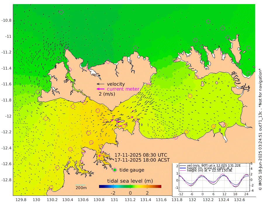 83cm/s 80T +4cm/s rms + 6cm/s 51T. Darwin_C1 52m 80cm/s 92T +4cm/s rms + 7cm/s -161T. Darwin_CW1 22m 57cm/s 72T +4cm/s rms + 8cm/s 61T. Darwin_CW2 34m 50cm/s 43T +3cm/s rms + 9cm/s 98T. Darwin_CW3 22m 97cm/s 90T +5cm/s rms + 7cm/s 88T. Darwin_C3 56m 37cm/s 66T +2cm/s rms + 9cm/s -126T. Darwin_CTbW 22m 7cm/s 14T +1cm/s rms + 1cm/s -47T. DARBGF 30m 10cm/s -38T +4cm/s rms + 3cm/s 80T. NRSDAR 19m -24cm Goodrich Bank 108cm Point Jenny 104cm Native Point 125cm Fish Reef 126cm Tapa Bay 46cm Point Fawcett (Offshore) 144cm Burge Point 116cm Munkunuwa 90cm Beagle A 136cm Parsons Bank 135cm Fenton Patches 140cm Hancox Shoal Area 146cm Nightcliff 157cm Darwin 137cm Charles Point Patches 131cm Glyde Point 131cm Chambers Bay 136cm Point Stuart 126cm Cape Hotham 115cm Christine Reef 150cm West Alligator Head 152cm East Field Island 110cm Two Hills Bay 103cm Camp Point 124cm Medina Inlet South 22cm South Barlow Point 8cm St. Asaph Bay -23cm Cape Van Dieman -21cm Snake Bay -13cm Cache Point 3cm Point Jahleel (Off) 42cm Cape Don 4cm Port Essington 3cm Smith Point - West 0cm NW Peacock Island -6cm North Of Jones Shoal -1cm Peacock Island 15cm Point David 2cm D'urville Point 19cm Copeland Island 16cm One Tree Point