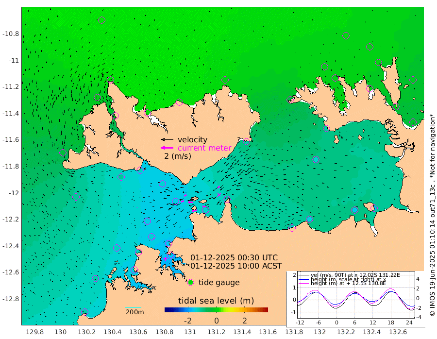 71cm/s -102T +4cm/s rms + 6cm/s 51T. Darwin_C1 52m 59cm/s -90T +4cm/s rms + 7cm/s -161T. Darwin_CW1 22m 48cm/s -107T +4cm/s rms + 8cm/s 61T. Darwin_CW2 34m 47cm/s -140T +3cm/s rms + 9cm/s 98T. Darwin_CW3 22m 81cm/s -90T +5cm/s rms + 7cm/s 88T. Darwin_C3 56m 40cm/s -115T +2cm/s rms + 9cm/s -126T. Darwin_CTbW 22m 6cm/s 163T +1cm/s rms + 1cm/s -47T. DARBGF 30m 10cm/s 151T +4cm/s rms + 3cm/s 80T. NRSDAR 19m 16cm Goodrich Bank -116cm Point Jenny -115cm Native Point -124cm Fish Reef -134cm Tapa Bay -41cm Point Fawcett (Offshore) -151cm Burge Point -109cm Munkunuwa -108cm Beagle A -137cm Parsons Bank -155cm Fenton Patches -147cm Hancox Shoal Area -164cm Nightcliff -162cm Darwin -138cm Charles Point Patches -143cm Glyde Point -147cm Chambers Bay -147cm Point Stuart -134cm Cape Hotham -137cm Christine Reef -161cm West Alligator Head -170cm East Field Island -118cm Two Hills Bay -122cm Camp Point -124cm Medina Inlet South -27cm South Barlow Point -10cm St. Asaph Bay 17cm Cape Van Dieman 11cm Snake Bay 9cm Cache Point -9cm Point Jahleel (Off) -47cm Cape Don -5cm Port Essington -7cm Smith Point - West -6cm NW Peacock Island 7cm North Of Jones Shoal 1cm Peacock Island -22cm Point David -8cm D'urville Point -24cm Copeland Island -19cm One Tree Point