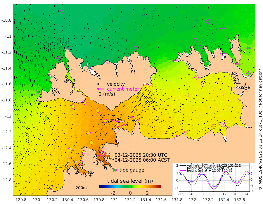 119cm/s 78T +4cm/s rms + 6cm/s 51T. Darwin_C1 52m 101cm/s 92T +4cm/s rms + 7cm/s -161T. Darwin_CW1 22m 59cm/s 71T +4cm/s rms + 8cm/s 61T. Darwin_CW2 34m 81cm/s 42T +3cm/s rms + 9cm/s 98T. Darwin_CW3 22m 104cm/s 90T +5cm/s rms + 7cm/s 88T. Darwin_C3 56m 54cm/s 65T +2cm/s rms + 9cm/s -126T. Darwin_CTbW 22m 18cm/s -70T +1cm/s rms + 1cm/s -47T. DARBGF 30m 24cm/s -41T +4cm/s rms + 3cm/s 80T. NRSDAR 19m -73cm Goodrich Bank 80cm Point Jenny 81cm Native Point 94cm Fish Reef 109cm Tapa Bay -18cm Point Fawcett (Offshore) 133cm Burge Point 98cm Munkunuwa 54cm Beagle A 138cm Parsons Bank 124cm Fenton Patches 140cm Hancox Shoal Area 140cm Nightcliff 159cm Darwin 120cm Charles Point Patches 136cm Glyde Point 130cm Chambers Bay 145cm Point Stuart 125cm Cape Hotham 119cm Christine Reef 159cm West Alligator Head 164cm East Field Island 108cm Two Hills Bay 111cm Camp Point 104cm Medina Inlet South -20cm South Barlow Point -52cm St. Asaph Bay -71cm Cape Van Dieman -61cm Snake Bay -68cm Cache Point -39cm Point Jahleel (Off) 22cm Cape Don -24cm Port Essington -28cm Smith Point - West -23cm NW Peacock Island -52cm North Of Jones Shoal -14cm Peacock Island 25cm Point David -17cm D'urville Point 30cm Copeland Island 13cm One Tree Point