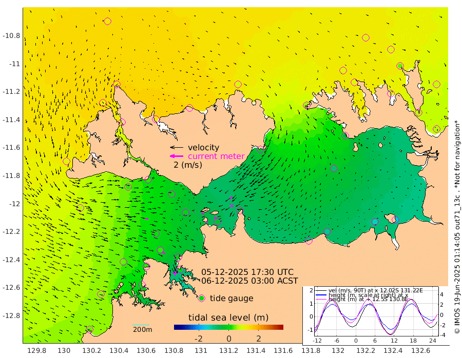 41cm/s -101T +4cm/s rms + 6cm/s 51T. Darwin_C1 52m 55cm/s -90T +4cm/s rms + 7cm/s -161T. Darwin_CW1 22m 9cm/s -113T +4cm/s rms + 8cm/s 61T. Darwin_CW2 34m 58cm/s -138T +3cm/s rms + 9cm/s 98T. Darwin_CW3 22m 40cm/s -90T +5cm/s rms + 7cm/s 88T. Darwin_C3 56m 2cm/s -74T +2cm/s rms + 9cm/s -126T. Darwin_CTbW 22m 50cm/s 97T +1cm/s rms + 1cm/s -47T. DARBGF 30m 52cm/s 130T +4cm/s rms + 3cm/s 80T. NRSDAR 19m 114cm Goodrich Bank 42cm Point Jenny 45cm Native Point 40cm Fish Reef 28cm Tapa Bay 100cm Point Fawcett (Offshore) 16cm Burge Point 27cm Munkunuwa 64cm Beagle A 9cm Parsons Bank 19cm Fenton Patches -7cm Hancox Shoal Area -4cm Nightcliff 2cm Darwin 32cm Charles Point Patches -30cm Glyde Point -91cm Chambers Bay -102cm Point Stuart -44cm Cape Hotham -82cm Christine Reef -126cm West Alligator Head -149cm East Field Island -51cm Two Hills Bay -46cm Camp Point 33cm Medina Inlet South 106cm South Barlow Point 110cm St. Asaph Bay 119cm Cape Van Dieman 121cm Snake Bay 113cm Cache Point 89cm Point Jahleel (Off) 50cm Cape Don 93cm Port Essington 92cm Smith Point - West 92cm NW Peacock Island 101cm North Of Jones Shoal 35cm Peacock Island 73cm Point David 93cm D'urville Point 65cm Copeland Island 76cm One Tree Point