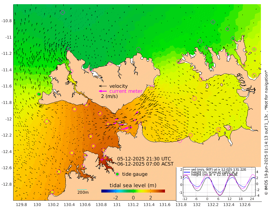 174cm/s 78T +4cm/s rms + 6cm/s 51T. Darwin_C1 52m 134cm/s 91T +4cm/s rms + 7cm/s -161T. Darwin_CW1 22m 78cm/s 72T +4cm/s rms + 8cm/s 61T. Darwin_CW2 34m 107cm/s 42T +3cm/s rms + 9cm/s 98T. Darwin_CW3 22m 127cm/s 89T +5cm/s rms + 7cm/s 88T. Darwin_C3 56m 84cm/s 65T +2cm/s rms + 9cm/s -126T. Darwin_CTbW 22m 6cm/s 1T +1cm/s rms + 1cm/s -47T. DARBGF 30m 10cm/s -1T +4cm/s rms + 3cm/s 80T. NRSDAR 19m -54cm Goodrich Bank 123cm Point Jenny 122cm Native Point 141cm Fish Reef 155cm Tapa Bay 18cm Point Fawcett (Offshore) 178cm Burge Point 142cm Munkunuwa 93cm Beagle A 190cm Parsons Bank 167cm Fenton Patches 186cm Hancox Shoal Area 180cm Nightcliff 209cm Darwin 172cm Charles Point Patches 165cm Glyde Point 137cm Chambers Bay 152cm Point Stuart 148cm Cape Hotham 125cm Christine Reef 162cm West Alligator Head 155cm East Field Island 124cm Two Hills Bay 122cm Camp Point 151cm Medina Inlet South 14cm South Barlow Point -25cm St. Asaph Bay -49cm Cape Van Dieman -38cm Snake Bay -45cm Cache Point -16cm Point Jahleel (Off) 51cm Cape Don 9cm Port Essington 5cm Smith Point - West 10cm NW Peacock Island -25cm North Of Jones Shoal -4cm Peacock Island 63cm Point David 19cm D'urville Point 69cm Copeland Island 49cm One Tree Point
