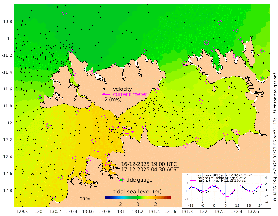 71cm/s 78T +4cm/s rms + 6cm/s 51T. Darwin_C1 52m 66cm/s 91T +4cm/s rms + 7cm/s -161T. Darwin_CW1 22m 40cm/s 73T +4cm/s rms + 8cm/s 61T. Darwin_CW2 34m 45cm/s 42T +3cm/s rms + 9cm/s 98T. Darwin_CW3 22m 74cm/s 90T +5cm/s rms + 7cm/s 88T. Darwin_C3 56m 33cm/s 65T +2cm/s rms + 9cm/s -126T. Darwin_CTbW 22m 3cm/s 2T +1cm/s rms + 1cm/s -47T. DARBGF 30m 5cm/s -11T +4cm/s rms + 3cm/s 80T. NRSDAR 19m -29cm Goodrich Bank 65cm Point Jenny 63cm Native Point 83cm Fish Reef 78cm Tapa Bay 15cm Point Fawcett (Offshore) 95cm Burge Point 69cm Munkunuwa 52cm Beagle A 96cm Parsons Bank 89cm Fenton Patches 92cm Hancox Shoal Area 94cm Nightcliff 114cm Darwin 95cm Charles Point Patches 95cm Glyde Point 85cm Chambers Bay 97cm Point Stuart 86cm Cape Hotham 74cm Christine Reef 103cm West Alligator Head 105cm East Field Island 78cm Two Hills Bay 75cm Camp Point 84cm Medina Inlet South 9cm South Barlow Point -12cm St. Asaph Bay -26cm Cape Van Dieman -19cm Snake Bay -22cm Cache Point -8cm Point Jahleel (Off) 35cm Cape Don 9cm Port Essington 3cm Smith Point - West 5cm NW Peacock Island -8cm North Of Jones Shoal 0cm Peacock Island 30cm Point David 10cm D'urville Point 33cm Copeland Island 29cm One Tree Point