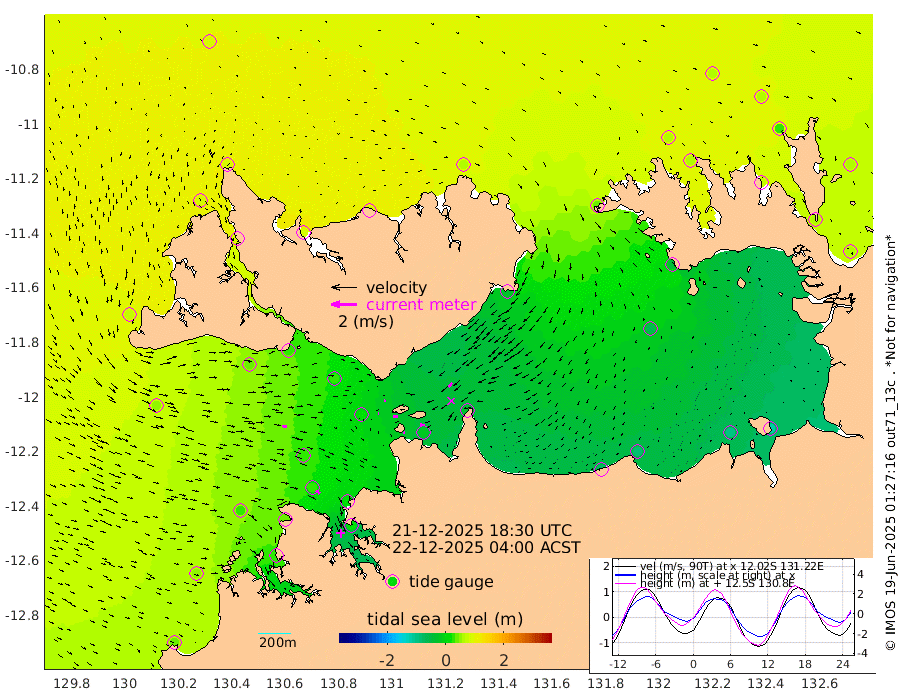 14cm/s -101T +4cm/s rms + 6cm/s 51T. Darwin_C1 52m 33cm/s -89T +4cm/s rms + 7cm/s -161T. Darwin_CW1 22m 8cm/s -110T +4cm/s rms + 8cm/s 61T. Darwin_CW2 34m 43cm/s -140T +3cm/s rms + 9cm/s 98T. Darwin_CW3 22m 36cm/s -91T +5cm/s rms + 7cm/s 88T. Darwin_C3 56m 10cm/s 54T +2cm/s rms + 9cm/s -126T. Darwin_CTbW 22m 36cm/s 98T +1cm/s rms + 1cm/s -47T. DARBGF 30m 38cm/s 131T +4cm/s rms + 3cm/s 80T. NRSDAR 19m 82cm Goodrich Bank 44cm Point Jenny 49cm Native Point 32cm Fish Reef 38cm Tapa Bay 71cm Point Fawcett (Offshore) 27cm Burge Point 35cm Munkunuwa 53cm Beagle A 23cm Parsons Bank 27cm Fenton Patches 12cm Hancox Shoal Area 13cm Nightcliff 13cm Darwin 32cm Charles Point Patches -16cm Glyde Point -73cm Chambers Bay -80cm Point Stuart -30cm Cape Hotham -58cm Christine Reef -99cm West Alligator Head -120cm East Field Island -42cm Two Hills Bay -30cm Camp Point 32cm Medina Inlet South 79cm South Barlow Point 79cm St. Asaph Bay 87cm Cape Van Dieman 89cm Snake Bay 79cm Cache Point 64cm Point Jahleel (Off) 35cm Cape Don 65cm Port Essington 64cm Smith Point - West 67cm NW Peacock Island 65cm North Of Jones Shoal 23cm Peacock Island 63cm Point David 68cm D'urville Point 57cm Copeland Island 58cm One Tree Point