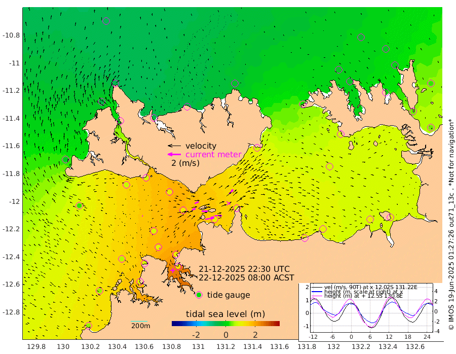 137cm/s 78T +4cm/s rms + 6cm/s 51T. Darwin_C1 52m 99cm/s 92T +4cm/s rms + 7cm/s -161T. Darwin_CW1 22m 56cm/s 71T +4cm/s rms + 8cm/s 61T. Darwin_CW2 34m 91cm/s 42T +3cm/s rms + 9cm/s 98T. Darwin_CW3 22m 89cm/s 89T +5cm/s rms + 7cm/s 88T. Darwin_C3 56m 64cm/s 66T +2cm/s rms + 9cm/s -126T. Darwin_CTbW 22m 9cm/s -63T +1cm/s rms + 1cm/s -47T. DARBGF 30m 15cm/s -33T +4cm/s rms + 3cm/s 80T. NRSDAR 19m -65cm Goodrich Bank 53cm Point Jenny 53cm Native Point 67cm Fish Reef 83cm Tapa Bay -16cm Point Fawcett (Offshore) 91cm Burge Point 73cm Munkunuwa 24cm Beagle A 110cm Parsons Bank 82cm Fenton Patches 115cm Hancox Shoal Area 114cm Nightcliff 129cm Darwin 98cm Charles Point Patches 104cm Glyde Point 101cm Chambers Bay 109cm Point Stuart 100cm Cape Hotham 83cm Christine Reef 119cm West Alligator Head 118cm East Field Island 85cm Two Hills Bay 83cm Camp Point 82cm Medina Inlet South -19cm South Barlow Point -46cm St. Asaph Bay -62cm Cape Van Dieman -49cm Snake Bay -59cm Cache Point -33cm Point Jahleel (Off) 20cm Cape Don -13cm Port Essington -17cm Smith Point - West -12cm NW Peacock Island -30cm North Of Jones Shoal -7cm Peacock Island 39cm Point David -4cm D'urville Point 45cm Copeland Island 30cm One Tree Point