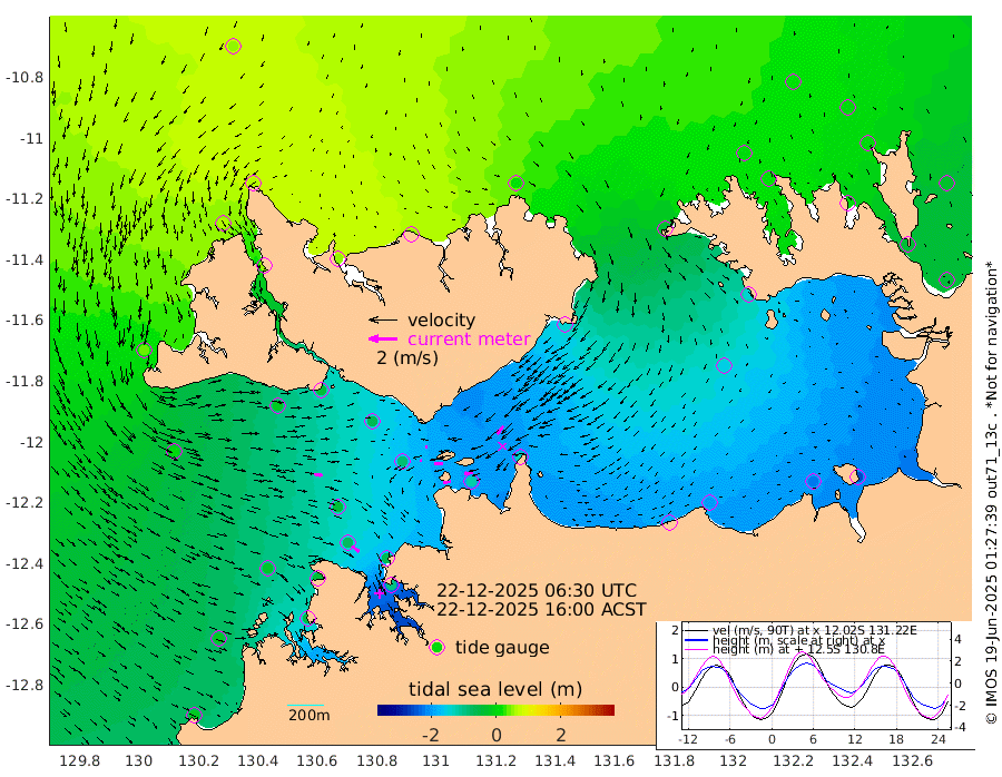 52cm/s -101T +4cm/s rms + 6cm/s 51T. Darwin_C1 52m 60cm/s -94T +4cm/s rms + 7cm/s -161T. Darwin_CW1 22m 12cm/s -101T +4cm/s rms + 8cm/s 61T. Darwin_CW2 34m 72cm/s -141T +3cm/s rms + 9cm/s 98T. Darwin_CW3 22m 59cm/s -89T +5cm/s rms + 7cm/s 88T. Darwin_C3 56m 15cm/s -115T +2cm/s rms + 9cm/s -126T. Darwin_CTbW 22m 57cm/s 98T +1cm/s rms + 1cm/s -47T. DARBGF 30m 66cm/s 128T +4cm/s rms + 3cm/s 80T. NRSDAR 19m 53cm Goodrich Bank -14cm Point Jenny -13cm Native Point -30cm Fish Reef -42cm Tapa Bay 35cm Point Fawcett (Offshore) -51cm Burge Point -11cm Munkunuwa 8cm Beagle A -61cm Parsons Bank -43cm Fenton Patches -80cm Hancox Shoal Area -66cm Nightcliff -97cm Darwin -70cm Charles Point Patches -123cm Glyde Point -180cm Chambers Bay -200cm Point Stuart -135cm Cape Hotham -152cm Christine Reef -222cm West Alligator Head -252cm East Field Island -144cm Two Hills Bay -142cm Camp Point -40cm Medina Inlet South 46cm South Barlow Point 58cm St. Asaph Bay 57cm Cape Van Dieman 47cm Snake Bay 46cm Cache Point 22cm Point Jahleel (Off) -35cm Cape Don 7cm Port Essington 16cm Smith Point - West 8cm NW Peacock Island 22cm North Of Jones Shoal 5cm Peacock Island -37cm Point David 8cm D'urville Point -40cm Copeland Island -32cm One Tree Point