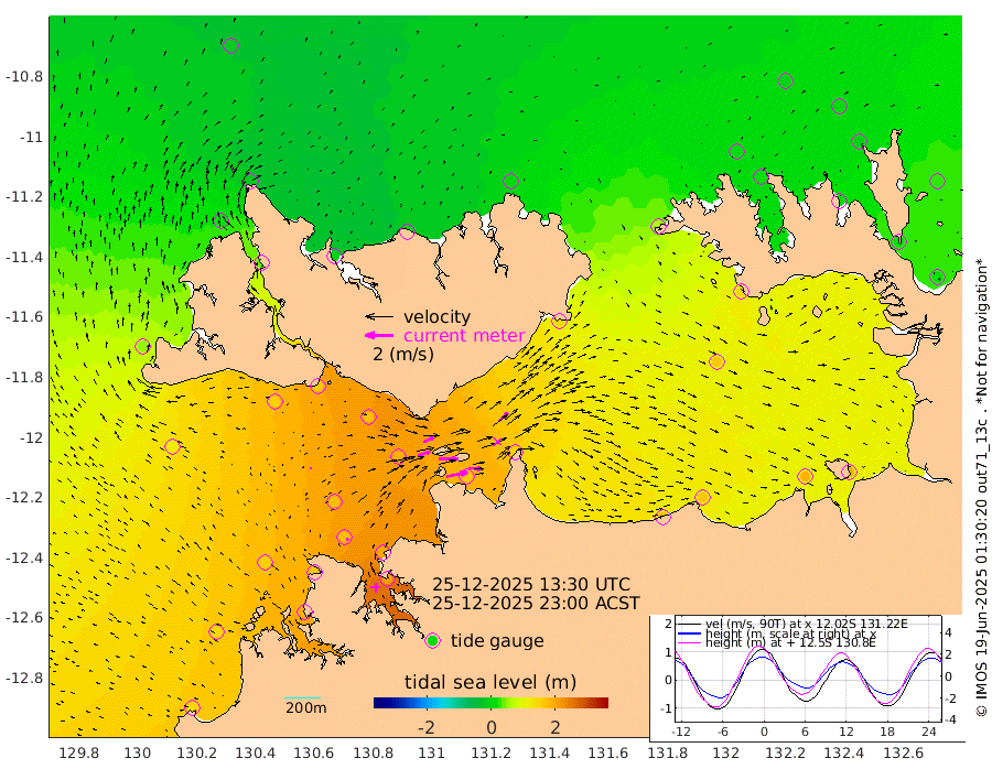 150cm/s 78T +4cm/s rms + 6cm/s 51T. Darwin_C1 52m 96cm/s 93T +4cm/s rms + 7cm/s -161T. Darwin_CW1 22m 91cm/s 71T +4cm/s rms + 8cm/s 61T. Darwin_CW2 34m 92cm/s 47T +3cm/s rms + 9cm/s 98T. Darwin_CW3 22m 140cm/s 90T +5cm/s rms + 7cm/s 88T. Darwin_C3 56m 79cm/s 66T +2cm/s rms + 9cm/s -126T. Darwin_CTbW 22m 9cm/s -4T +1cm/s rms + 1cm/s -47T. DARBGF 30m 18cm/s -29T +4cm/s rms + 3cm/s 80T. NRSDAR 19m -17cm Goodrich Bank 144cm Point Jenny 143cm Native Point 151cm Fish Reef 165cm Tapa Bay 54cm Point Fawcett (Offshore) 187cm Burge Point 148cm Munkunuwa 121cm Beagle A 179cm Parsons Bank 179cm Fenton Patches 183cm Hancox Shoal Area 200cm Nightcliff 205cm Darwin 175cm Charles Point Patches 168cm Glyde Point 173cm Chambers Bay 165cm Point Stuart 151cm Cape Hotham 162cm Christine Reef 182cm West Alligator Head 184cm East Field Island 137cm Two Hills Bay 137cm Camp Point 163cm Medina Inlet South 42cm South Barlow Point 16cm St. Asaph Bay -18cm Cape Van Dieman -10cm Snake Bay -10cm Cache Point 10cm Point Jahleel (Off) 63cm Cape Don 10cm Port Essington 12cm Smith Point - West 8cm NW Peacock Island -3cm North Of Jones Shoal 0cm Peacock Island 19cm Point David 11cm D'urville Point 21cm Copeland Island 23cm One Tree Point