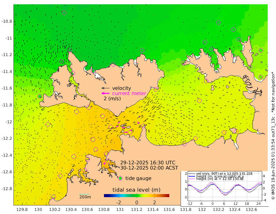 77cm/s 78T +4cm/s rms + 6cm/s 51T. Darwin_C1 52m 49cm/s 88T +4cm/s rms + 7cm/s -161T. Darwin_CW1 22m 48cm/s 72T +4cm/s rms + 8cm/s 61T. Darwin_CW2 34m 44cm/s 47T +3cm/s rms + 9cm/s 98T. Darwin_CW3 22m 78cm/s 89T +5cm/s rms + 7cm/s 88T. Darwin_C3 56m 45cm/s 64T +2cm/s rms + 9cm/s -126T. Darwin_CTbW 22m 6cm/s -40T +1cm/s rms + 1cm/s -47T. DARBGF 30m 12cm/s -30T +4cm/s rms + 3cm/s 80T. NRSDAR 19m -26cm Goodrich Bank 89cm Point Jenny 89cm Native Point 95cm Fish Reef 103cm Tapa Bay 19cm Point Fawcett (Offshore) 122cm Burge Point 92cm Munkunuwa 73cm Beagle A 120cm Parsons Bank 117cm Fenton Patches 119cm Hancox Shoal Area 126cm Nightcliff 133cm Darwin 105cm Charles Point Patches 116cm Glyde Point 113cm Chambers Bay 120cm Point Stuart 107cm Cape Hotham 105cm Christine Reef 130cm West Alligator Head 131cm East Field Island 98cm Two Hills Bay 94cm Camp Point 99cm Medina Inlet South 15cm South Barlow Point -8cm St. Asaph Bay -24cm Cape Van Dieman -15cm Snake Bay -19cm Cache Point -1cm Point Jahleel (Off) 41cm Cape Don 5cm Port Essington 5cm Smith Point - West 7cm NW Peacock Island -13cm North Of Jones Shoal -2cm Peacock Island 34cm Point David 11cm D'urville Point 36cm Copeland Island 28cm One Tree Point