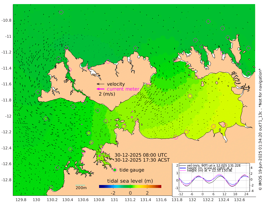 11cm/s 85T +4cm/s rms + 6cm/s 51T. Darwin_C1 52m 33cm/s 92T +4cm/s rms + 7cm/s -161T. Darwin_CW1 22m 4cm/s -106T +4cm/s rms + 8cm/s 61T. Darwin_CW2 34m 24cm/s 32T +3cm/s rms + 9cm/s 98T. Darwin_CW3 22m 11cm/s 101T +5cm/s rms + 7cm/s 88T. Darwin_C3 56m 1cm/s 108T +2cm/s rms + 9cm/s -126T. Darwin_CTbW 22m 25cm/s -81T +1cm/s rms + 1cm/s -47T. DARBGF 30m 30cm/s -58T +4cm/s rms + 3cm/s 80T. NRSDAR 19m -16cm Goodrich Bank 25cm Point Jenny 22cm Native Point 23cm Fish Reef 30cm Tapa Bay -3cm Point Fawcett (Offshore) 35cm Burge Point 3cm Munkunuwa 24cm Beagle A 19cm Parsons Bank 42cm Fenton Patches 42cm Hancox Shoal Area 47cm Nightcliff 39cm Darwin 35cm Charles Point Patches 62cm Glyde Point 100cm Chambers Bay 100cm Point Stuart 67cm Cape Hotham 96cm Christine Reef 114cm West Alligator Head 137cm East Field Island 68cm Two Hills Bay 77cm Camp Point 19cm Medina Inlet South -18cm South Barlow Point -12cm St. Asaph Bay -20cm Cape Van Dieman -25cm Snake Bay -11cm Cache Point -4cm Point Jahleel (Off) 13cm Cape Don -12cm Port Essington -11cm Smith Point - West -11cm NW Peacock Island -10cm North Of Jones Shoal -4cm Peacock Island -12cm Point David -14cm D'urville Point -9cm Copeland Island -10cm One Tree Point