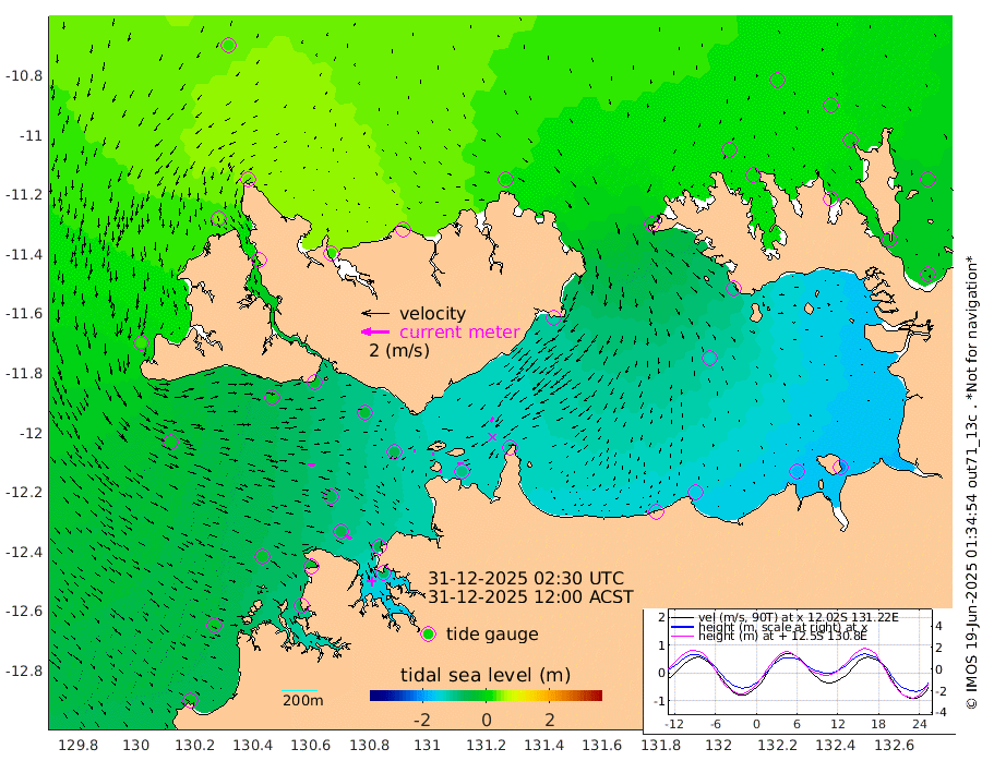 12cm/s -96T +4cm/s rms + 6cm/s 51T. Darwin_C1 52m 39cm/s -96T +4cm/s rms + 7cm/s -161T. Darwin_CW1 22m 11cm/s 69T +4cm/s rms + 8cm/s 61T. Darwin_CW2 34m 38cm/s -147T +3cm/s rms + 9cm/s 98T. Darwin_CW3 22m 12cm/s -77T +5cm/s rms + 7cm/s 88T. Darwin_C3 56m 4cm/s 68T +2cm/s rms + 9cm/s -126T. Darwin_CTbW 22m 48cm/s 97T +1cm/s rms + 1cm/s -47T. DARBGF 30m 53cm/s 125T +4cm/s rms + 3cm/s 80T. NRSDAR 19m 32cm Goodrich Bank -19cm Point Jenny -19cm Native Point -26cm Fish Reef -33cm Tapa Bay 27cm Point Fawcett (Offshore) -52cm Burge Point -3cm Munkunuwa -19cm Beagle A -40cm Parsons Bank -56cm Fenton Patches -58cm Hancox Shoal Area -59cm Nightcliff -69cm Darwin -50cm Charles Point Patches -97cm Glyde Point -137cm Chambers Bay -152cm Point Stuart -103cm Cape Hotham -128cm Christine Reef -169cm West Alligator Head -203cm East Field Island -106cm Two Hills Bay -118cm Camp Point -27cm Medina Inlet South 32cm South Barlow Point 38cm St. Asaph Bay 37cm Cape Van Dieman 32cm Snake Bay 29cm Cache Point 13cm Point Jahleel (Off) -22cm Cape Don 12cm Port Essington 17cm Smith Point - West 11cm NW Peacock Island 22cm North Of Jones Shoal 7cm Peacock Island -12cm Point David 12cm D'urville Point -15cm Copeland Island -9cm One Tree Point