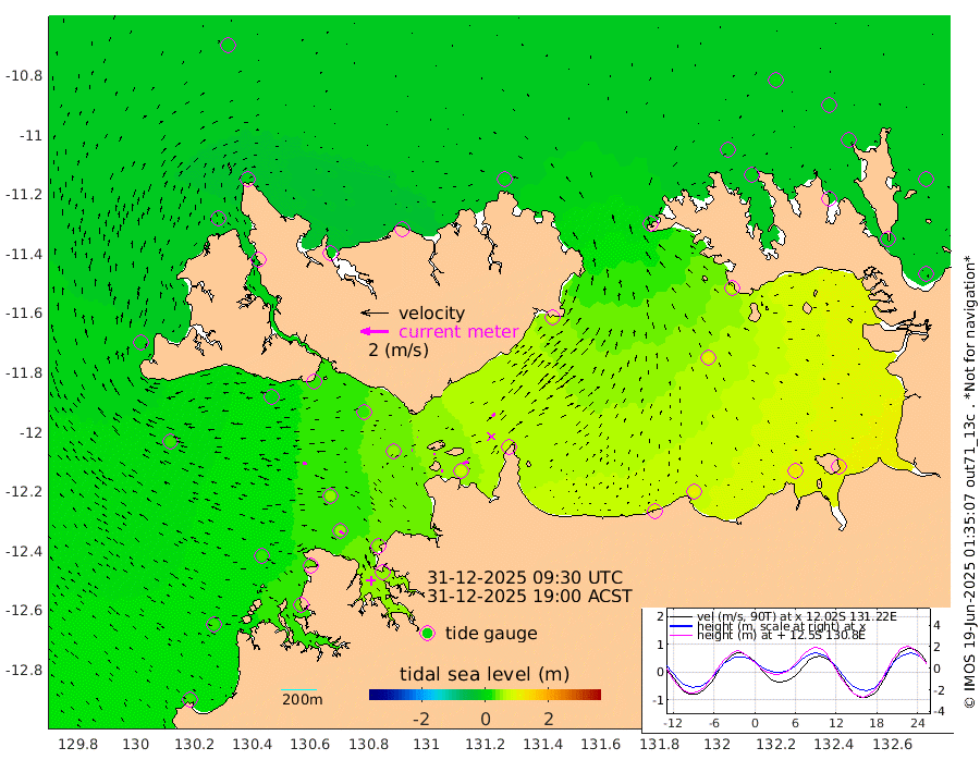 10cm/s 83T +4cm/s rms + 6cm/s 51T. Darwin_C1 52m 42cm/s 89T +4cm/s rms + 7cm/s -161T. Darwin_CW1 22m 4cm/s -109T +4cm/s rms + 8cm/s 61T. Darwin_CW2 34m 28cm/s 34T +3cm/s rms + 9cm/s 98T. Darwin_CW3 22m 15cm/s 100T +5cm/s rms + 7cm/s 88T. Darwin_C3 56m 3cm/s -134T +2cm/s rms + 9cm/s -126T. Darwin_CTbW 22m 29cm/s -81T +1cm/s rms + 1cm/s -47T. DARBGF 30m 36cm/s -56T +4cm/s rms + 3cm/s 80T. NRSDAR 19m 0cm Goodrich Bank 30cm Point Jenny 27cm Native Point 28cm Fish Reef 35cm Tapa Bay 7cm Point Fawcett (Offshore) 44cm Burge Point 9cm Munkunuwa 30cm Beagle A 26cm Parsons Bank 48cm Fenton Patches 47cm Hancox Shoal Area 51cm Nightcliff 50cm Darwin 47cm Charles Point Patches 68cm Glyde Point 105cm Chambers Bay 104cm Point Stuart 72cm Cape Hotham 101cm Christine Reef 117cm West Alligator Head 143cm East Field Island 74cm Two Hills Bay 86cm Camp Point 28cm Medina Inlet South -6cm South Barlow Point 1cm St. Asaph Bay -7cm Cape Van Dieman -9cm Snake Bay 2cm Cache Point 7cm Point Jahleel (Off) 21cm Cape Don -1cm Port Essington -3cm Smith Point - West -3cm NW Peacock Island 2cm North Of Jones Shoal -1cm Peacock Island -7cm Point David -7cm D'urville Point -6cm Copeland Island -3cm One Tree Point