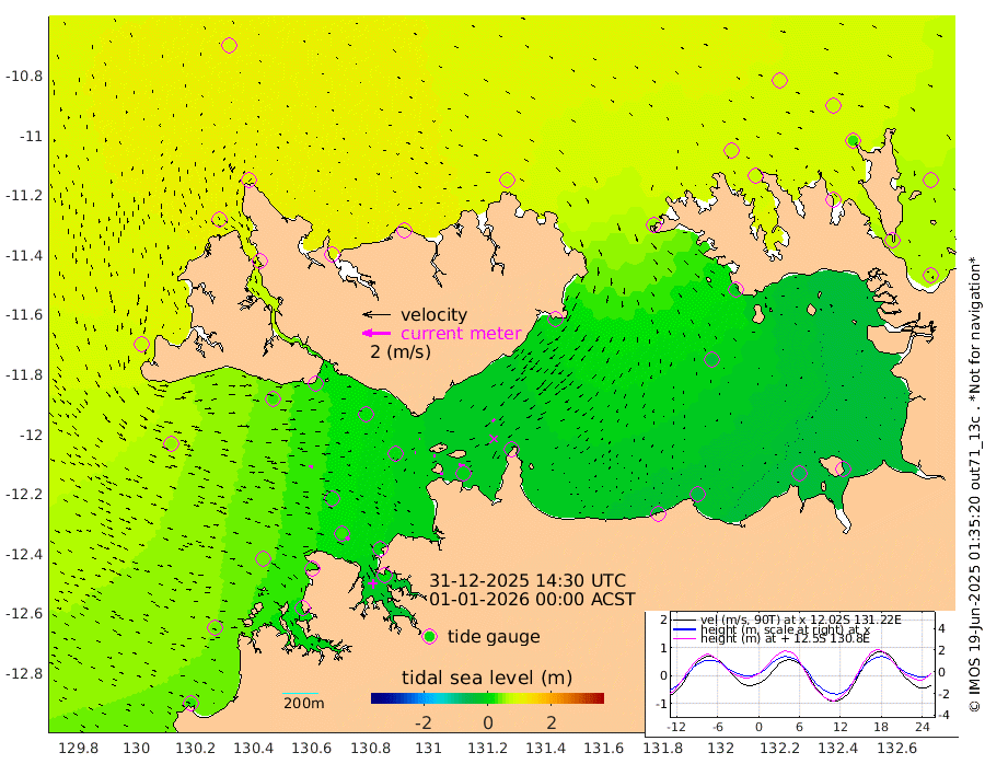24cm/s -99T +4cm/s rms + 6cm/s 51T. Darwin_C1 52m 45cm/s -91T +4cm/s rms + 7cm/s -161T. Darwin_CW1 22m 1cm/s 104T +4cm/s rms + 8cm/s 61T. Darwin_CW2 34m 28cm/s -138T +3cm/s rms + 9cm/s 98T. Darwin_CW3 22m 12cm/s -89T +5cm/s rms + 7cm/s 88T. Darwin_C3 56m 2cm/s -89T +2cm/s rms + 9cm/s -126T. Darwin_CTbW 22m 29cm/s 96T +1cm/s rms + 1cm/s -47T. DARBGF 30m 29cm/s 128T +4cm/s rms + 3cm/s 80T. NRSDAR 19m 89cm Goodrich Bank 33cm Point Jenny 36cm Native Point 36cm Fish Reef 25cm Tapa Bay 75cm Point Fawcett (Offshore) 20cm Burge Point 25cm Munkunuwa 50cm Beagle A 19cm Parsons Bank 22cm Fenton Patches 6cm Hancox Shoal Area 5cm Nightcliff 15cm Darwin 33cm Charles Point Patches -5cm Glyde Point -42cm Chambers Bay -47cm Point Stuart -12cm Cape Hotham -38cm Christine Reef -60cm West Alligator Head -75cm East Field Island -13cm Two Hills Bay -17cm Camp Point 32cm Medina Inlet South 82cm South Barlow Point 82cm St. Asaph Bay 91cm Cape Van Dieman 96cm Snake Bay 89cm Cache Point 74cm Point Jahleel (Off) 48cm Cape Don 76cm Port Essington 77cm Smith Point - West 78cm NW Peacock Island 80cm North Of Jones Shoal 28cm Peacock Island 63cm Point David 78cm D'urville Point 57cm Copeland Island 66cm One Tree Point