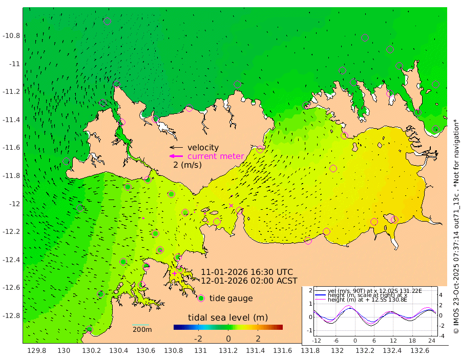 12cm/s 79T +4cm/s rms + 6cm/s 51T. Darwin_C1 52m 9cm/s 87T +4cm/s rms + 7cm/s -161T. Darwin_CW1 22m 9cm/s 74T +4cm/s rms + 8cm/s 61T. Darwin_CW2 34m 19cm/s 41T +3cm/s rms + 9cm/s 98T. Darwin_CW3 22m 32cm/s 93T +5cm/s rms + 7cm/s 88T. Darwin_C3 56m 5cm/s 65T +2cm/s rms + 9cm/s -126T. Darwin_CTbW 22m 31cm/s -82T +1cm/s rms + 1cm/s -47T. DARBGF 30m 37cm/s -52T +4cm/s rms + 3cm/s 80T. NRSDAR 19m -46cm Goodrich Bank 6cm Point Jenny 4cm Native Point 21cm Fish Reef 13cm Tapa Bay -31cm Point Fawcett (Offshore) 30cm Burge Point 0cm Munkunuwa -2cm Beagle A 31cm Parsons Bank 28cm Fenton Patches 35cm Hancox Shoal Area 28cm Nightcliff 47cm Darwin 27cm Charles Point Patches 73cm Glyde Point 110cm Chambers Bay 130cm Point Stuart 80cm Cape Hotham 96cm Christine Reef 146cm West Alligator Head 166cm East Field Island 91cm Two Hills Bay 81cm Camp Point 17cm Medina Inlet South -38cm South Barlow Point -49cm St. Asaph Bay -48cm Cape Van Dieman -45cm Snake Bay -39cm Cache Point -24cm Point Jahleel (Off) 18cm Cape Don -13cm Port Essington -18cm Smith Point - West -15cm NW Peacock Island -28cm North Of Jones Shoal -8cm Peacock Island 7cm Point David -13cm D'urville Point 10cm Copeland Island 7cm One Tree Point