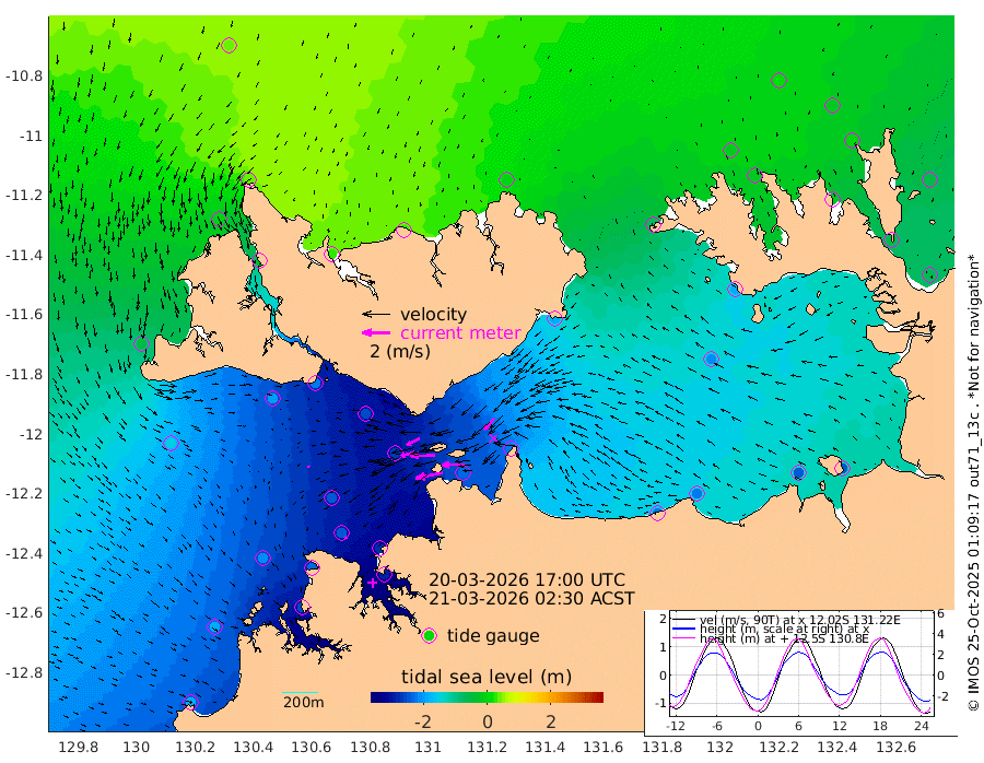 198cm/s -101T +4cm/s rms + 6cm/s 51T. Darwin_C1 52m 158cm/s -91T +4cm/s rms + 7cm/s -161T. Darwin_CW1 22m 99cm/s -106T +4cm/s rms + 8cm/s 61T. Darwin_CW2 34m 110cm/s -137T +3cm/s rms + 9cm/s 98T. Darwin_CW3 22m 173cm/s -90T +5cm/s rms + 7cm/s 88T. Darwin_C3 56m 106cm/s -116T +2cm/s rms + 9cm/s -126T. Darwin_CTbW 22m 10cm/s 161T +1cm/s rms + 1cm/s -47T. DARBGF 30m 20cm/s 160T +4cm/s rms + 3cm/s 80T. NRSDAR 19m 41cm Goodrich Bank -185cm Point Jenny -184cm Native Point -203cm Fish Reef -226cm Tapa Bay -55cm Point Fawcett (Offshore) -252cm Burge Point -202cm Munkunuwa -152cm Beagle A -254cm Parsons Bank -244cm Fenton Patches -262cm Hancox Shoal Area -271cm Nightcliff -291cm Darwin -246cm Charles Point Patches -235cm Glyde Point -221cm Chambers Bay -223cm Point Stuart -214cm Cape Hotham -204cm Christine Reef -244cm West Alligator Head -244cm East Field Island -184cm Two Hills Bay -185cm Camp Point -219cm Medina Inlet South -42cm South Barlow Point -3cm St. Asaph Bay 40cm Cape Van Dieman 27cm Snake Bay 32cm Cache Point -3cm Point Jahleel (Off) -76cm Cape Don -13cm Port Essington -14cm Smith Point - West -13cm NW Peacock Island 14cm North Of Jones Shoal 2cm Peacock Island -54cm Point David -21cm D'urville Point -59cm Copeland Island -46cm One Tree Point