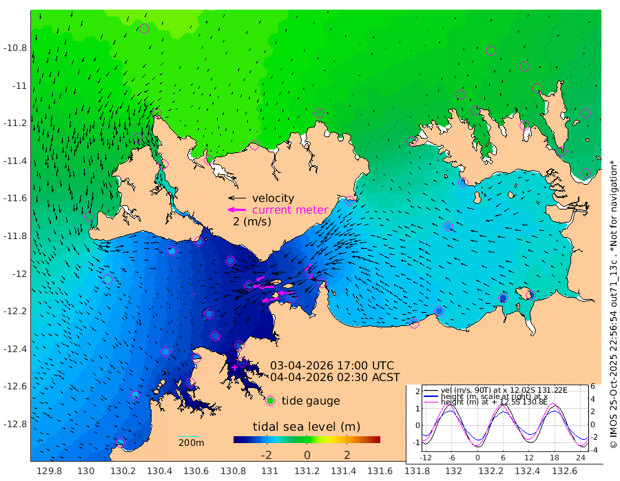 190cm/s -101T +4cm/s rms + 6cm/s 51T. Darwin_C1 52m 160cm/s -92T +4cm/s rms + 7cm/s -161T. Darwin_CW1 22m 90cm/s -105T +4cm/s rms + 8cm/s 61T. Darwin_CW2 34m 109cm/s -136T +3cm/s rms + 9cm/s 98T. Darwin_CW3 22m 169cm/s -90T +5cm/s rms + 7cm/s 88T. Darwin_C3 56m 96cm/s -116T +2cm/s rms + 9cm/s -126T. Darwin_CTbW 22m 12cm/s 148T +1cm/s rms + 1cm/s -47T. DARBGF 30m 23cm/s 151T +4cm/s rms + 3cm/s 80T. NRSDAR 19m 28cm Goodrich Bank -174cm Point Jenny -170cm Native Point -205cm Fish Reef -207cm Tapa Bay -69cm Point Fawcett (Offshore) -241cm Burge Point -190cm Munkunuwa -145cm Beagle A -241cm Parsons Bank -225cm Fenton Patches -241cm Hancox Shoal Area -246cm Nightcliff -280cm Darwin -240cm Charles Point Patches -231cm Glyde Point -220cm Chambers Bay -233cm Point Stuart -216cm Cape Hotham -199cm Christine Reef -253cm West Alligator Head -255cm East Field Island -194cm Two Hills Bay -183cm Camp Point -214cm Medina Inlet South -50cm South Barlow Point -13cm St. Asaph Bay 27cm Cape Van Dieman 14cm Snake Bay 14cm Cache Point -16cm Point Jahleel (Off) -90cm Cape Don -31cm Port Essington -27cm Smith Point - West -26cm NW Peacock Island -7cm North Of Jones Shoal -5cm Peacock Island -60cm Point David -33cm D'urville Point -65cm Copeland Island -62cm One Tree Point